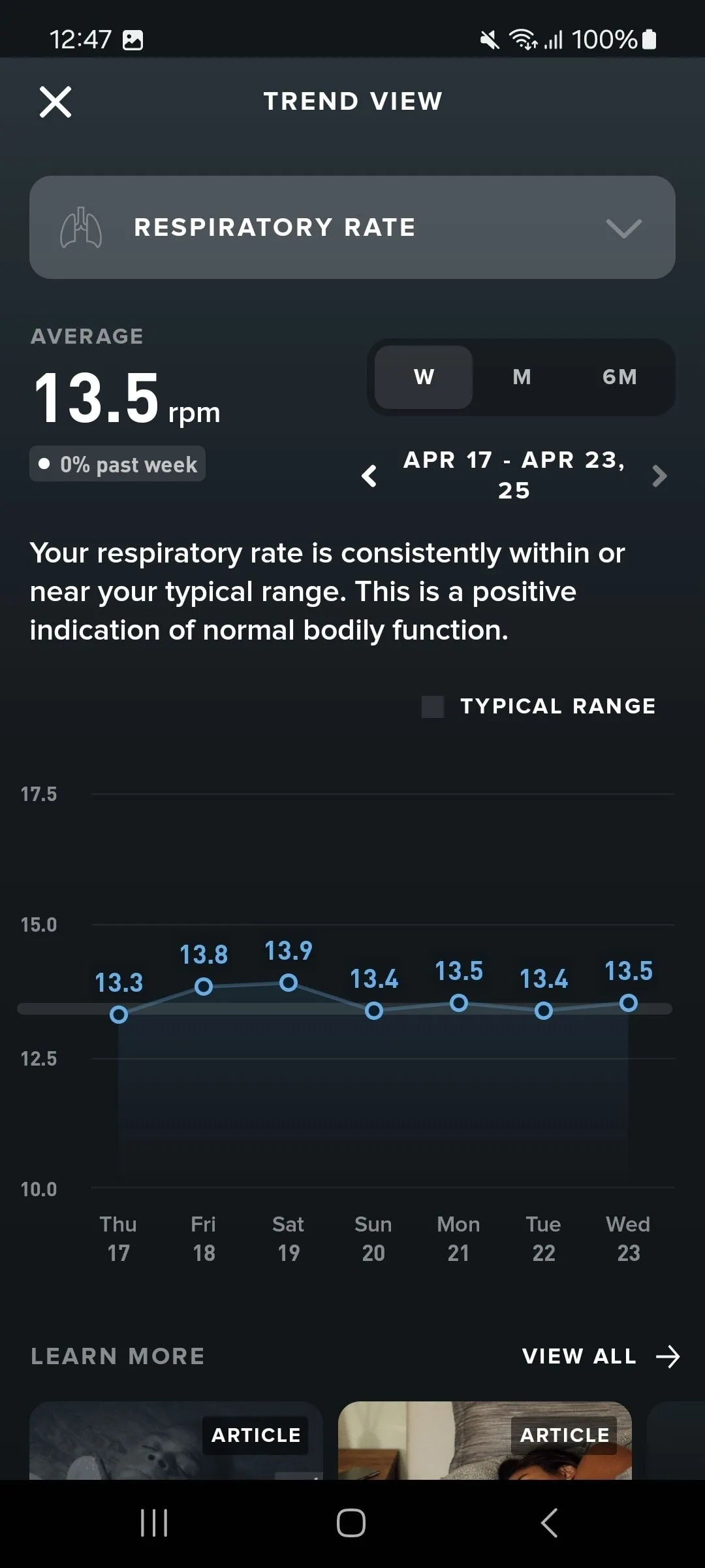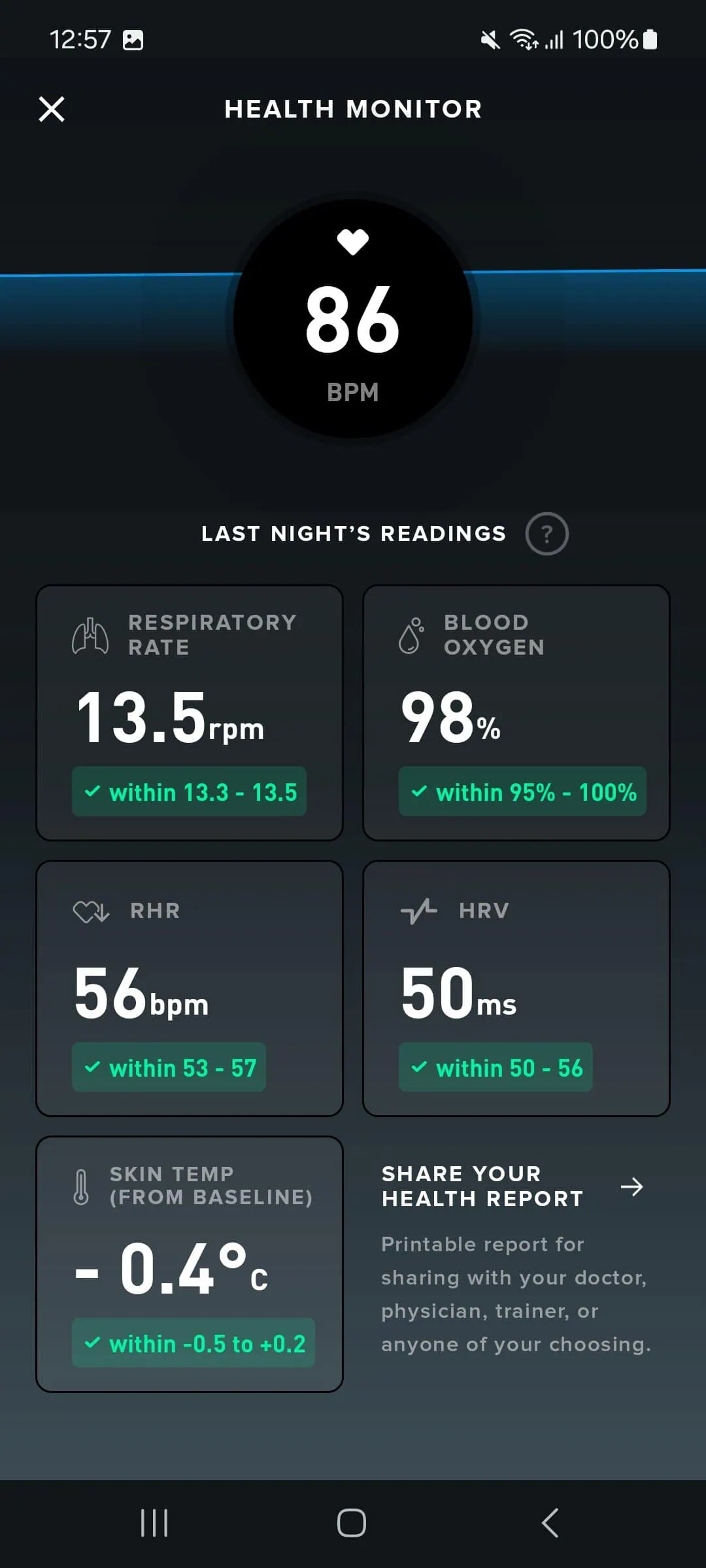 Na dole ekranu znajdziesz przejrzysty panel z metrykami, które możesz dostosować do swoich najważniejszych potrzeb. Chcesz mieć pod kontrolą na przykład dług senny? Żaden problem – wystarczy przypiąć go na ekran główny i masz go zawsze pod ręką, bez zbędnego szukania. Każda z metryk jest uzupełniona o średnią z ostatnich 30 dni oraz strzałkę wskazującą spadek lub wzrost względem tej średniej.