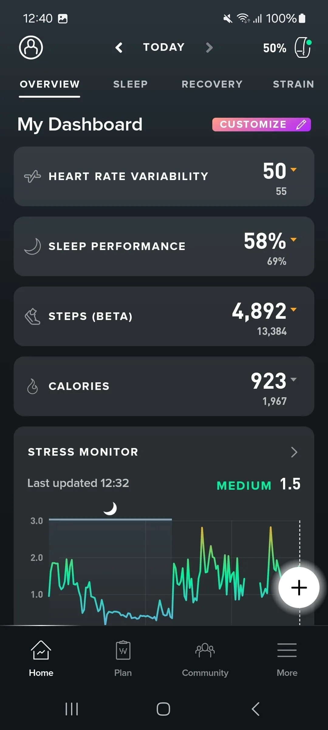 Karta Overview pełni funkcję ekranu głównego i daje podstawowy wgląd w Twój aktualny stan zdrowia. Na początku znajdziesz wartości kluczowych parametrów – Recovery (regeneracja), Strain (wysiłek fizyczny), wynik snu oraz zmienność tętna. Dostępne są także odnośniki i oceny ogólnego stanu zdrowia (Health monitor) oraz poziomu stresu (Stress monitor).