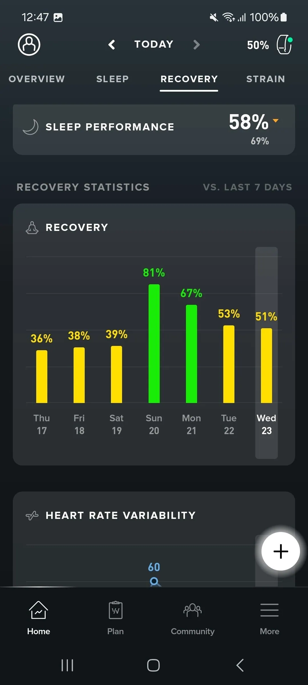 W moim przypadku wynik regeneracji wahał się niemal dokładnie zgodnie z moimi przewidywaniami. Testowałem opaskę w okresie dużego obciążenia, na które oprócz stresu psychicznego wpłynął także gorszy sen. Najczęściej znajdowałem się w żółtych wartościach Recovery, co nie jest optymalne.
