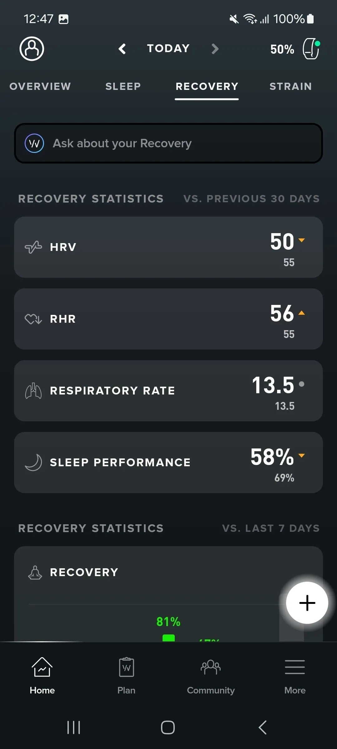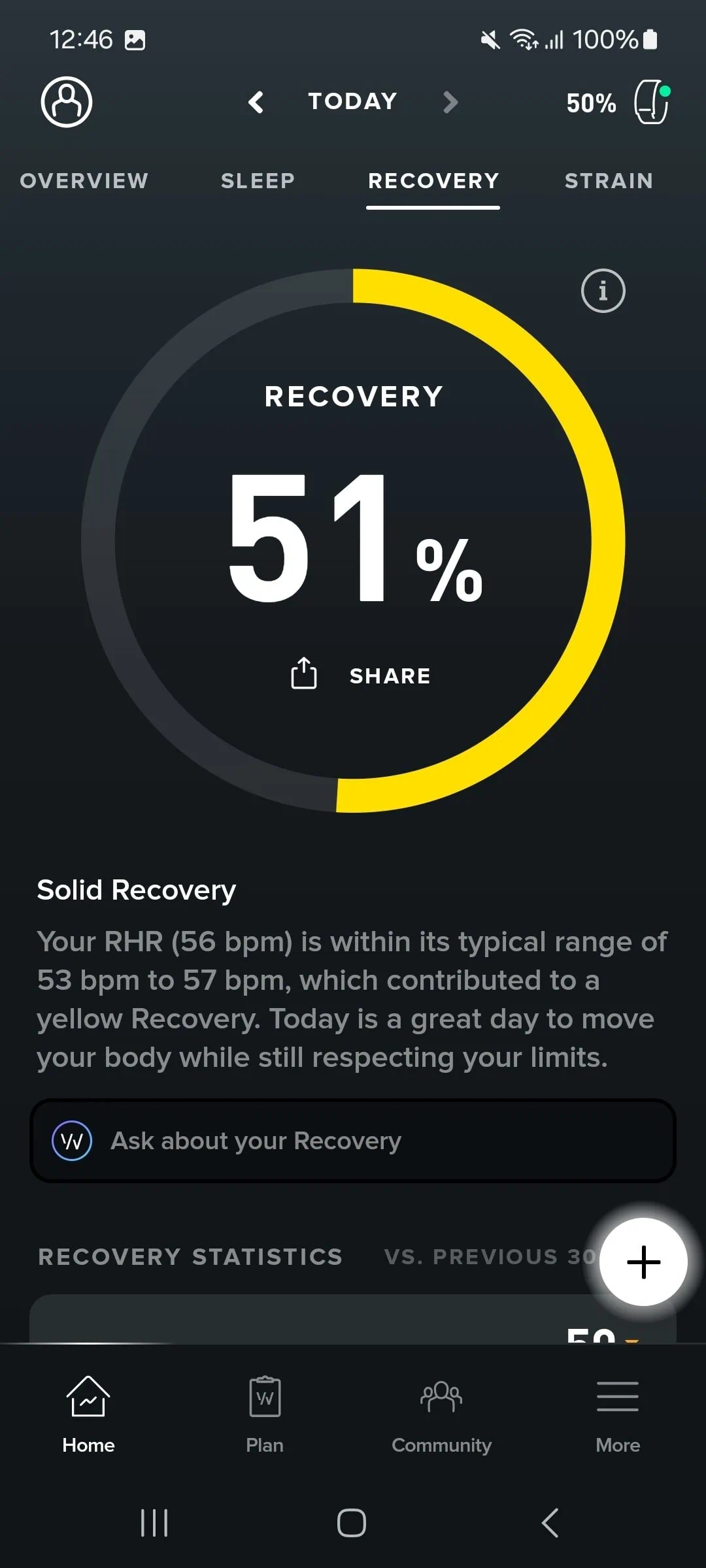 Do obliczeń brana jest pod uwagę zmienność tętna, tętno spoczynkowe, częstotliwość oddechu oraz wynik snu. Wszystkie te czynniki prezentowane są ze średnią z ostatnich dni, a jednym kliknięciem możesz sprawdzić ich szczegóły. Informacje są bardzo przejrzyste i zwięzłe, a dodatkowo dostępna jest ikona asystenta WHOOP Coach, który może zaoferować szerszy kontekst.