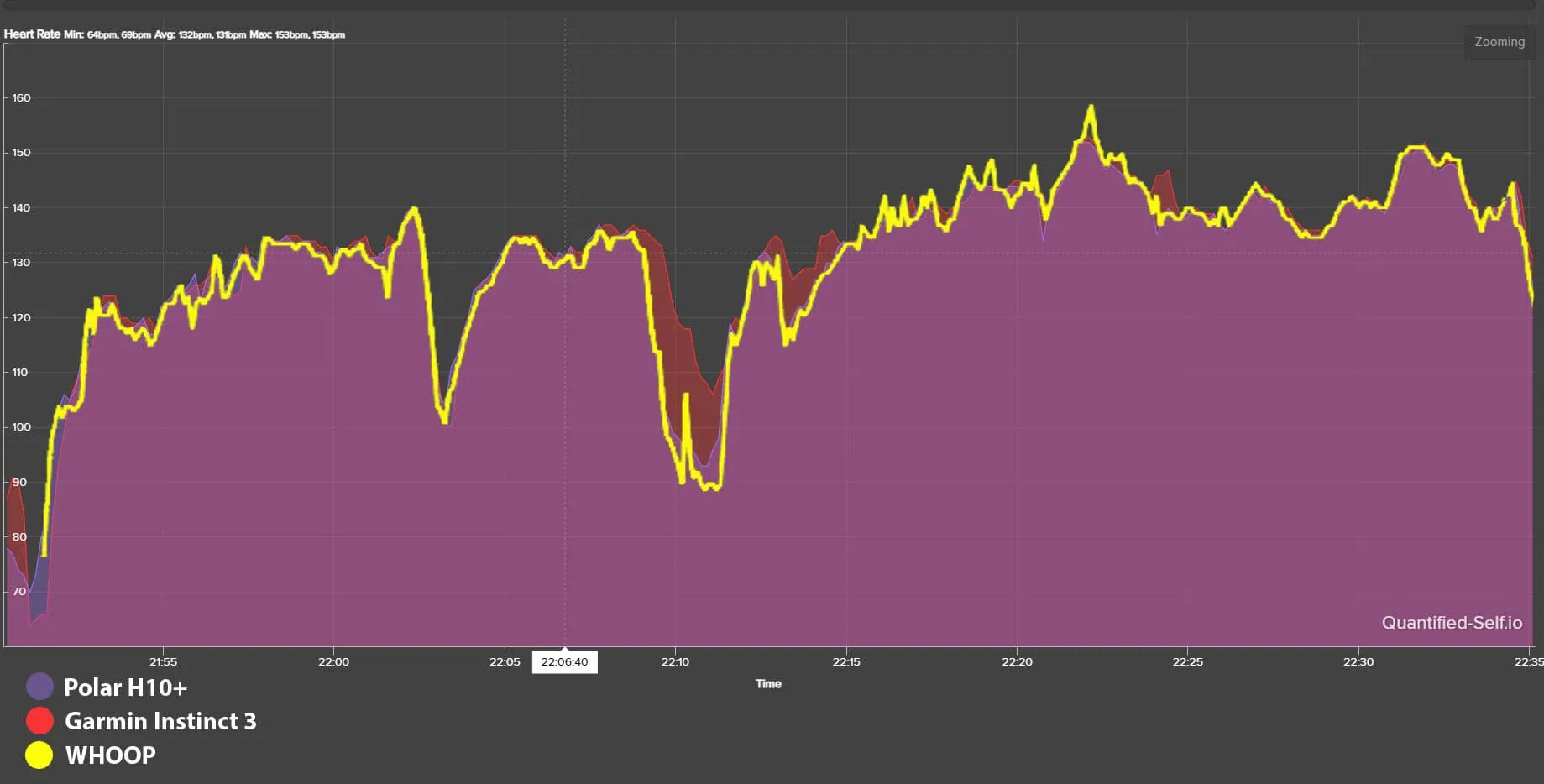 Jak widać na poniższym wykresie, krzywa WHOOP jest bardzo zbliżona do tej z pasa piersiowego, z drobnymi odchyleniami. Zegarek Garmin Instinct 3 wypada w tym porównaniu najsłabiej. Głównym powodem jest to, że tracker WHOOP znacznie lepiej przylegał do mojego nadgarstka niż zegarek z kopertą 45 mm. Ostatecznie oceniam tracker bardzo pozytywnie.