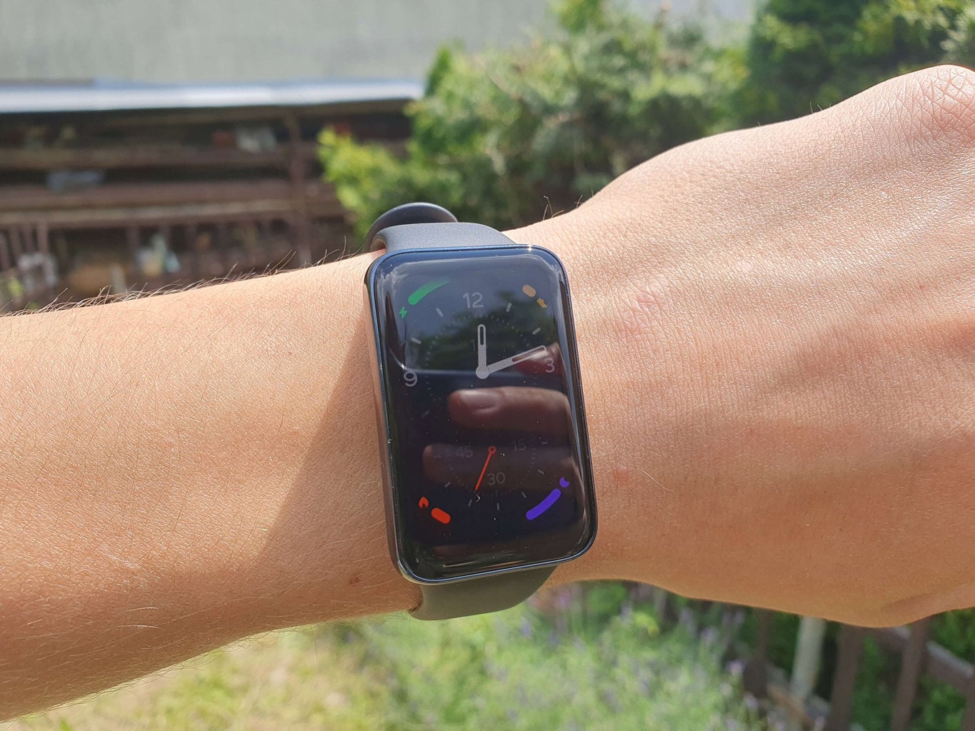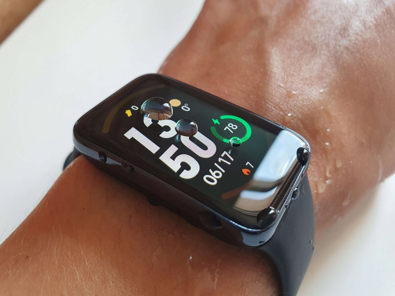 Byliśmy pod wrażeniem nie tylko rozmiaru wyświetlacza, ale także jego wysokiego kontrastu i powłoki zapobiegającej pozostawaniu odcisków palców, która okazała się skuteczna podczas testów. Dzięki maksymalnej jasności 500 nitów wyświetlacz jest czytelny nawet w bezpośrednim świetle słonecznym. Największą słabością ekranu jest dłuższy czas reakcji podczas wyświetlania niektórych bardziej skomplikowanych animacji (np. wyświetlanie listy powiadomień). Problem występował również w przypadku zachlapania wyświetlacza wodą, kiedy doszło do aktywacji opaski i samoczynnego poruszania się po interfejsie.