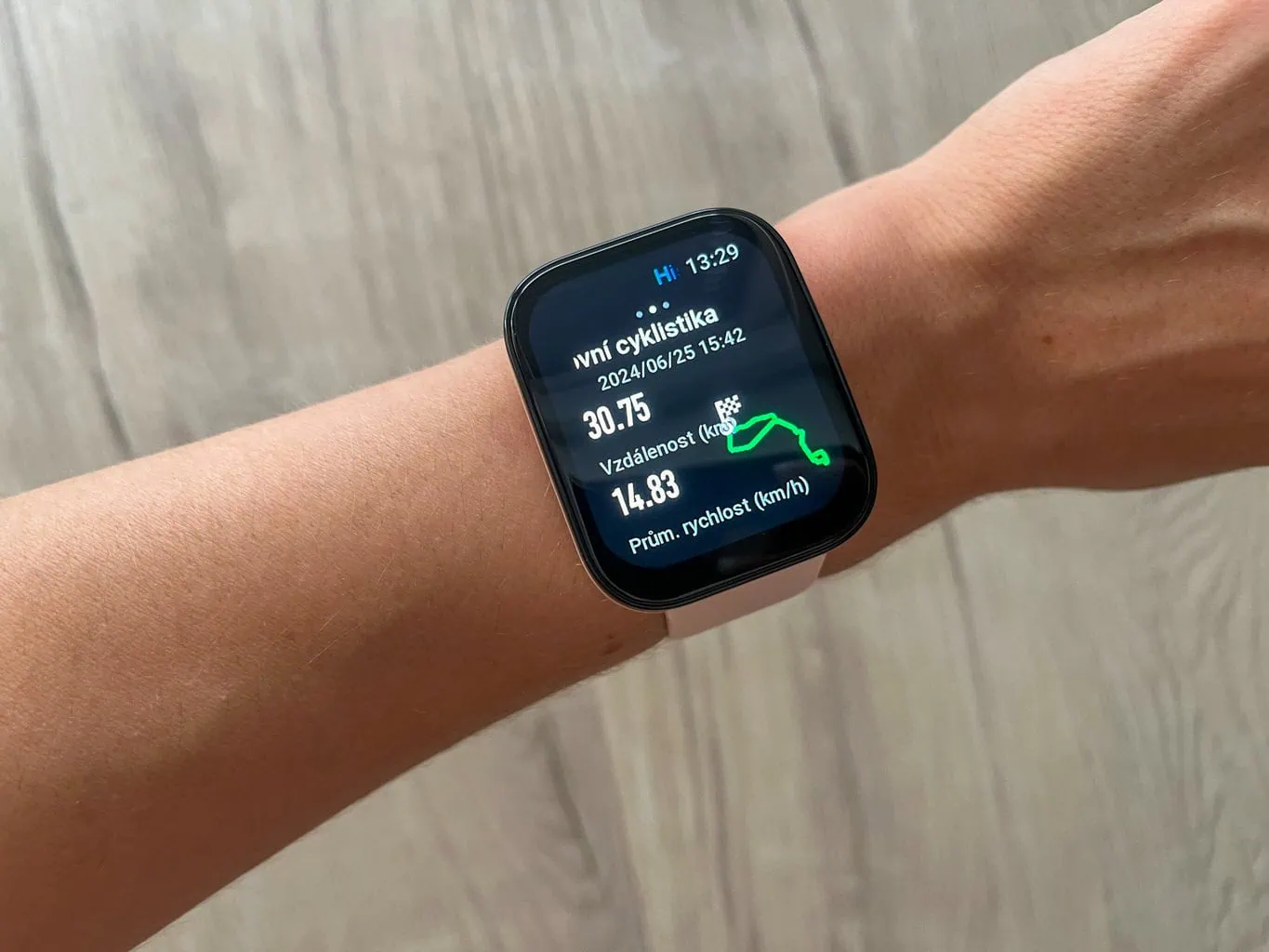 Podczas ćwiczeń zegarek będzie pokazywał dane w zależności od tego, jaką aktywność zdecydujemy się wykonywać. W przypadku chodzenia, biegania i jazdy na rowerze obejmują one czas ćwiczeń, dystans, tętno i aktualną prędkość. Po zakończeniu ćwiczeń, w przypadku chodzenia i biegania, można wyświetlić kadencję (liczbę kroków na minutę), szacunkową długość kroku i pełne statystyki tętna. W przypadku jazdy na rowerze dostępne są szczegółowe informacje dotyczące prędkości.