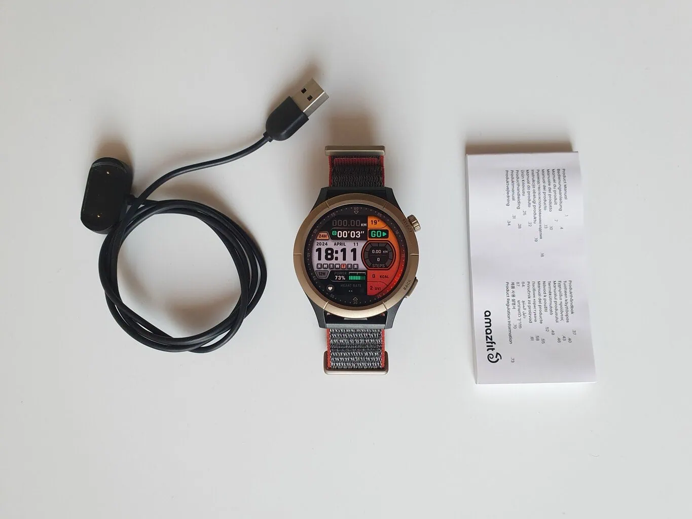 Oprócz samego zegarka, opakowanie zawiera również ładowarkę i dokumentację użytkownika.