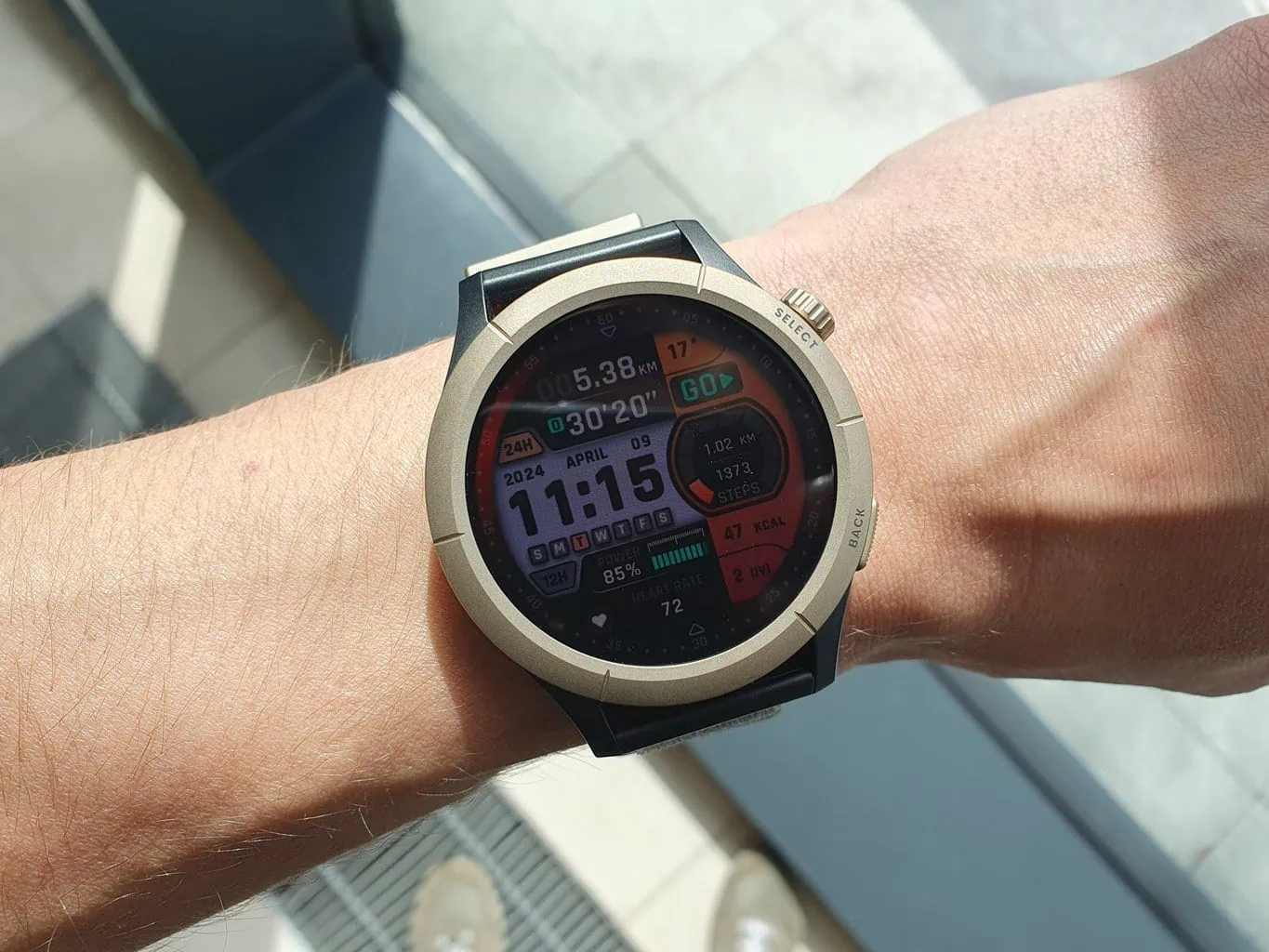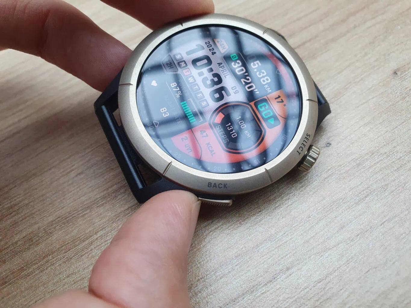 W porównaniu z wieloma konkurencyjnymi zegarkami, Amazfit Cheetah Pro posiada nieco większy wyświetlacz. W większości zegarków z kopertą 47 mm częściej można spotkać wyświetlacz o przekątnej 1,43 cala i rozdzielczości 466 x 466 pikseli. Cheetah Pro, z 1,45-calową średnicą wyświetlacza i rozdzielczością 480 x 480 px, jest więc nietypowy. Jednocześnie maksymalna jasność wyświetlacza wynosi 1000 nitów, dzięki czemu jest czytelny w bezpośrednim świetle słonecznym.
