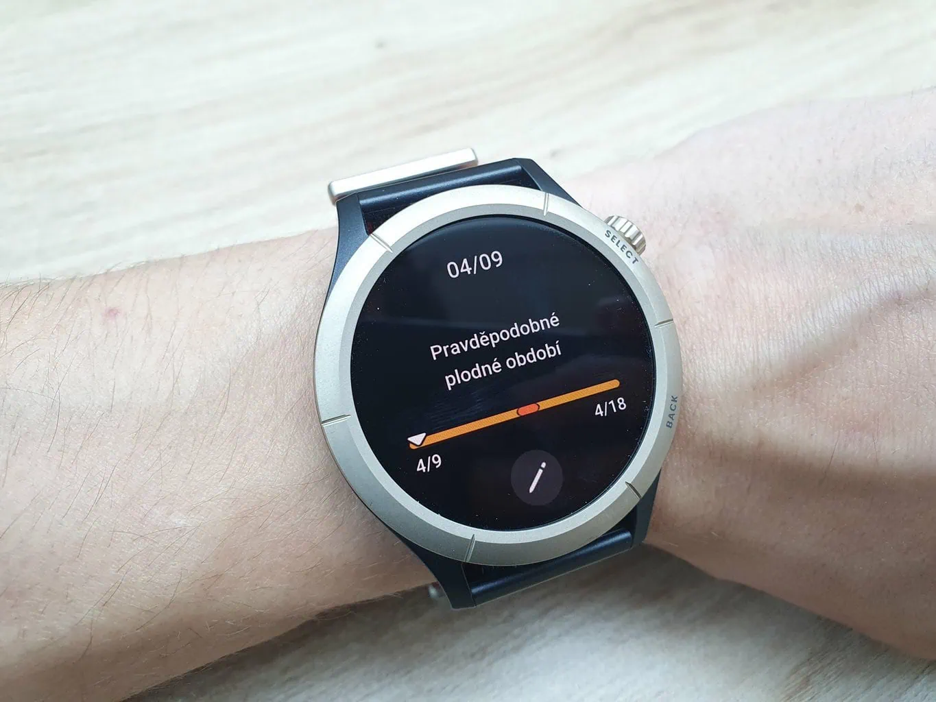 Smartwatch umożliwia także śledzenie cyklu menstruacyjnego. Urządzenie szacuje rozwój cyklu na podstawie początku ostatniej miesiączki, jej średniej długości i długości całego cyklu. Zegarek informuje, kiedy użytkowniczka może spodziewać się kolejnej miesiączki lub dni płodnych (owulacji).