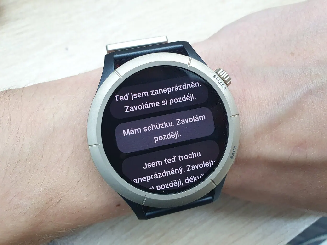 Kolejną przydatną funkcją jest odpowiadanie na powiadomienia. Ponieważ zegarek nie obsługuje wyświetlania klawiatury, użytkownicy mogą skorzystać wyłącznie z domyślnych odpowiedzi tekstowych. Można je dowolnie edytować, dodawać i usuwać w aplikacji Zepp.