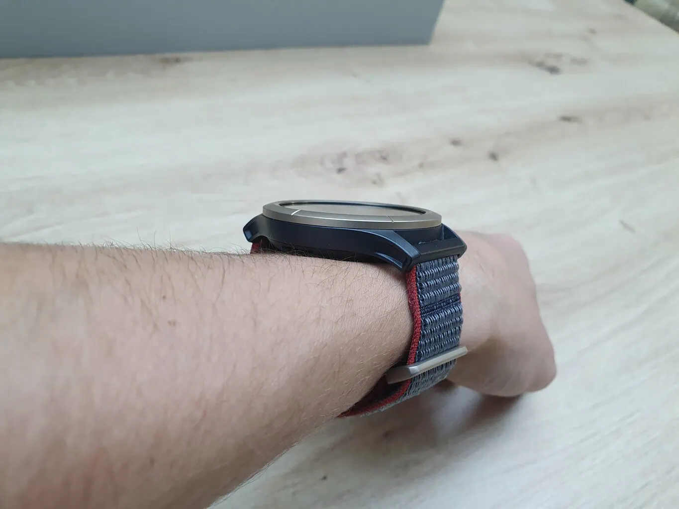 Zegarek na pierwszy rzut oka wygląda na sportowy i bardzo jakościowy. Jednak kiedy po raz pierwszy trzymałem go w dłoni, nie mogłem pozbyć się wrażenia, że jest wykonany z plastiku i wygląda nieco tanio. Sam zegarek waży zaledwie 34 g, a z nylonowym paskiem 43 g. Tylko mniejsze zegarki sportowe, takie jak Garmin Forerunner 165 z 1,2-calowym wyświetlaczem mają podobnie niską wagę.