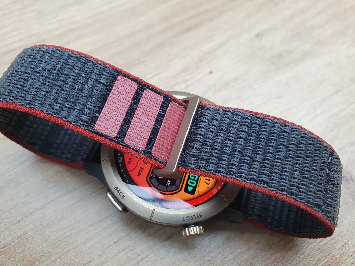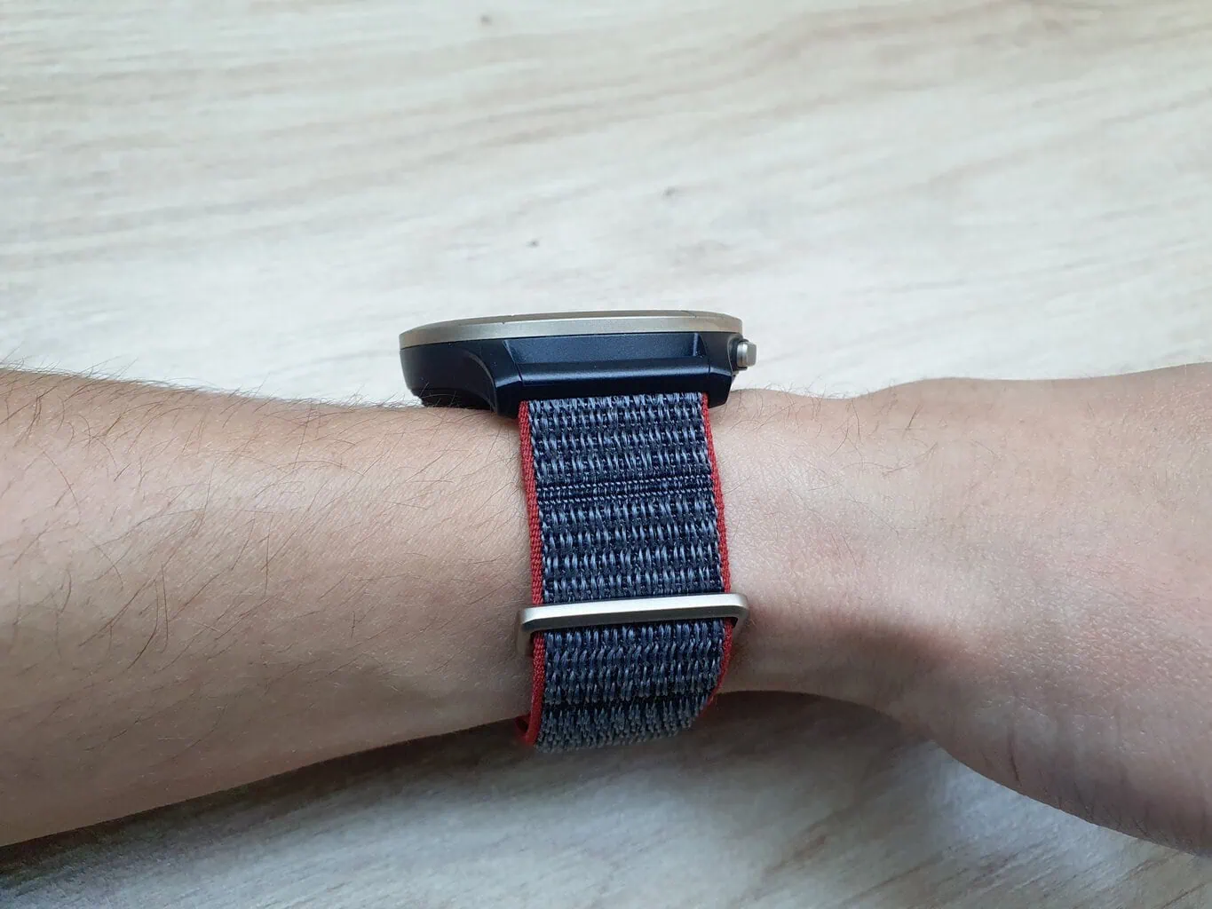 Jak zauważyliście na zdjęciach w tej recenzji, testowałem zegarek w kolorze czarnym z beżową ramką i nylonowym paskiem. Większość producentów sportowych smartwatchów oferuje silikonowy lub poliuretanowy pasek jako wariant podstawowy, a pasek nylonowy wyłącznie jako dodatek. Ponieważ w tej kategorii zegarków mam doświadczenie tylko z "gumowymi" paskami, byłem bardzo ciekawy nylonu.
