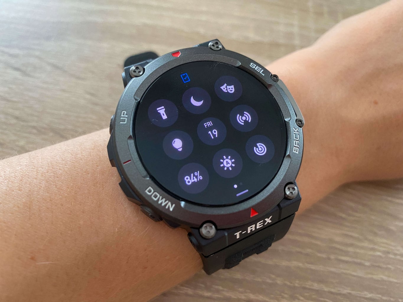 Jego jasność można łatwo regulować w ustawieniach lub pozwolić zegarkowi na automatyczne dostosowanie jasności. Cieszy również obecność trybu Always-On, który pozwala zegarkowi wyświetlać godzinę na wyłączonym wyświetlaczu. Grafikę i styl poszczególnych ikon również oceniamy pozytywne. Łatwo można rozpoznać, jaka funkcja kryje się za każdą ikoną.