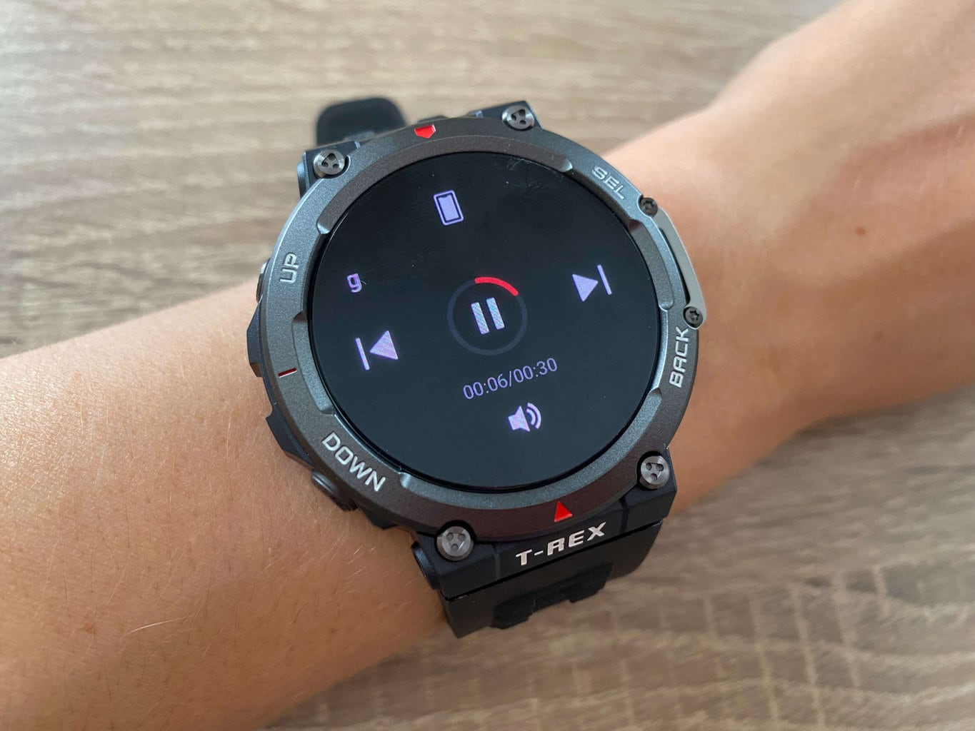 Jeśli odtwarzasz muzykę na telefonie komórkowym (na przykład za pośrednictwem Spotify lub YouTube), możesz sterować nią za pomocą zegarka. Odtwarzane utwory można wstrzymywać, uruchamiać ponownie i przełączać (na poprzedni lub następny utwór). Dostępna jest również funkcja regulacji głośności.