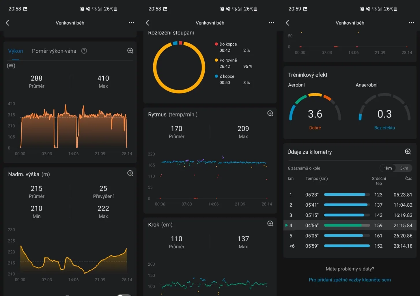 Efekt treningu informuje, czy trening był aerobowy czy anaerobowy. Ponieważ mój zegarek mierzył wyższe tętno przy większej liczbie aktywności, otrzymywałem również punkty w strefie beztlenowej. Moje biegi są raczej typowo rekreacyjne i skupiają się na kondycji, więc ten odczyt nie był zbyt dokładny. Zegarek Garmin Fenix 8 był w tym względzie lepszy, ponieważ informował tylko o obciążeniu aerobowym, które było obliczane na podstawie dokładniejszego odczytu tętna.