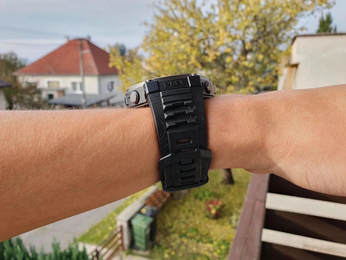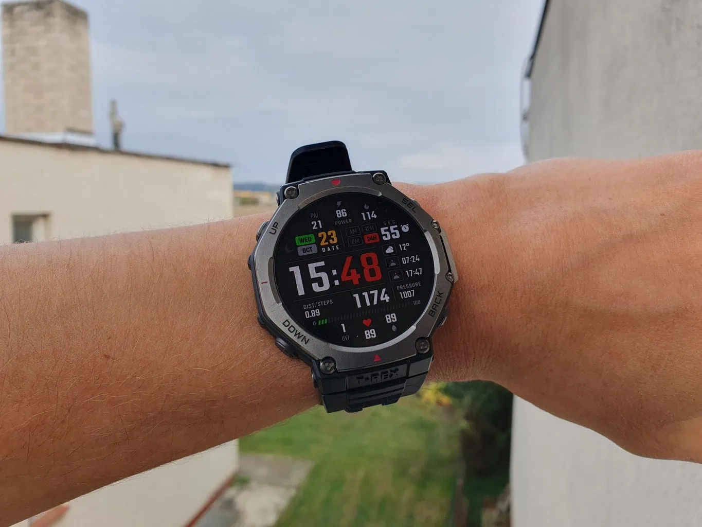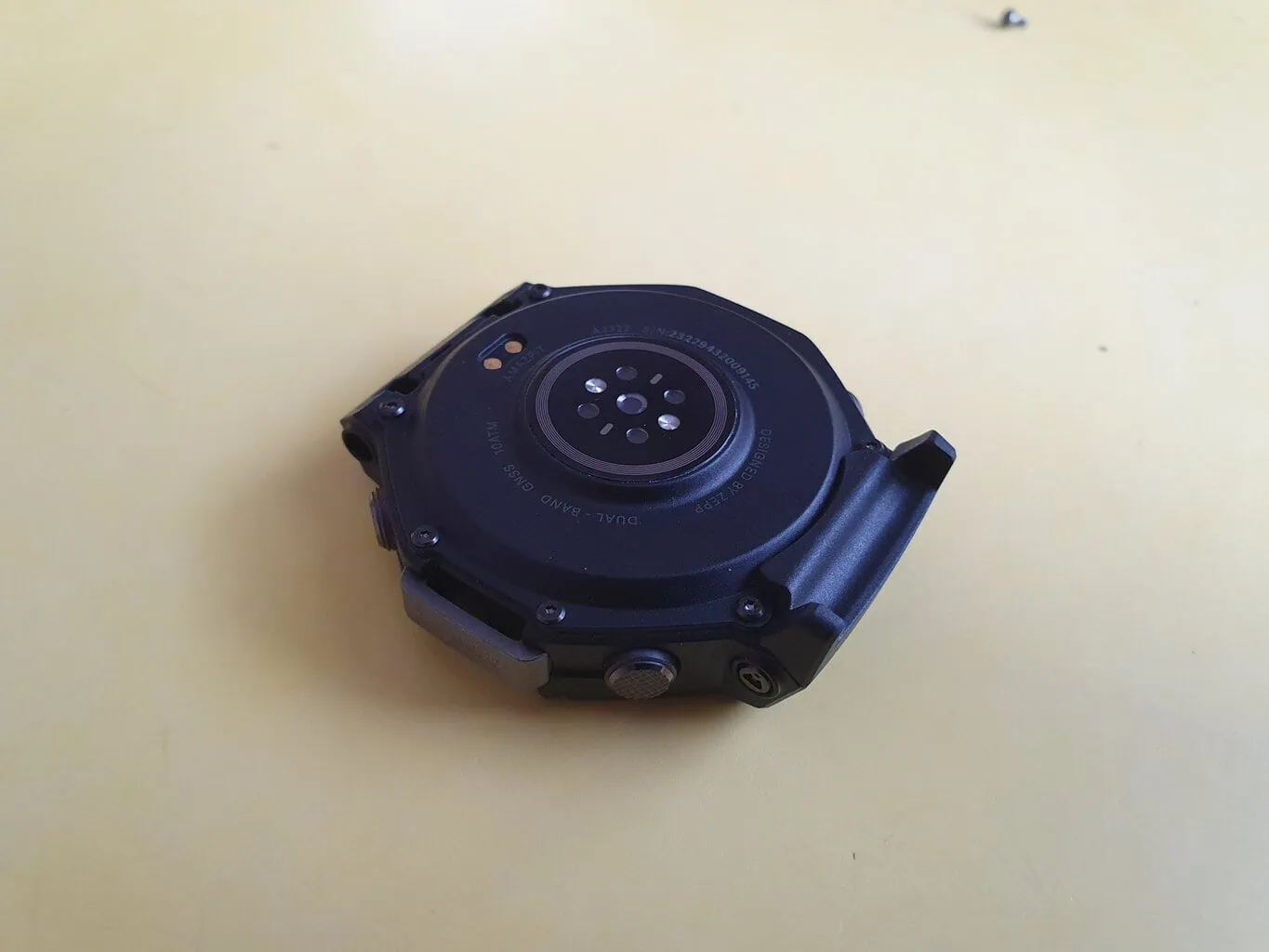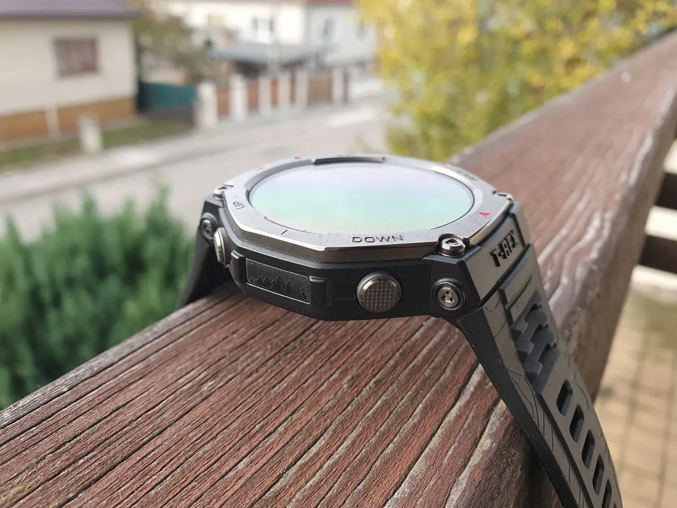 Obudowa zegarka składa się z plastiku i metalowej lunety, kombinacji, który jest typowa dla zegarków outdoorowych. Bardziej ekskluzywne zegarki, takie jak Garmin Fenix 8, posiadają tytanową lunetę, podczas gdy w bardziej przystępnym cenowo Amazfit T-Rex 3 mamy do czynienia ze stalą nierdzewną. Jednak w praktyce nie poczujesz dużej różnicy między materiałami, dopóki nie uszkodzisz zegarka. Luneta jest lekko skośna, dzięki czemu zegarek jest w znacznym stopniu odporny na uderzenia z boku.