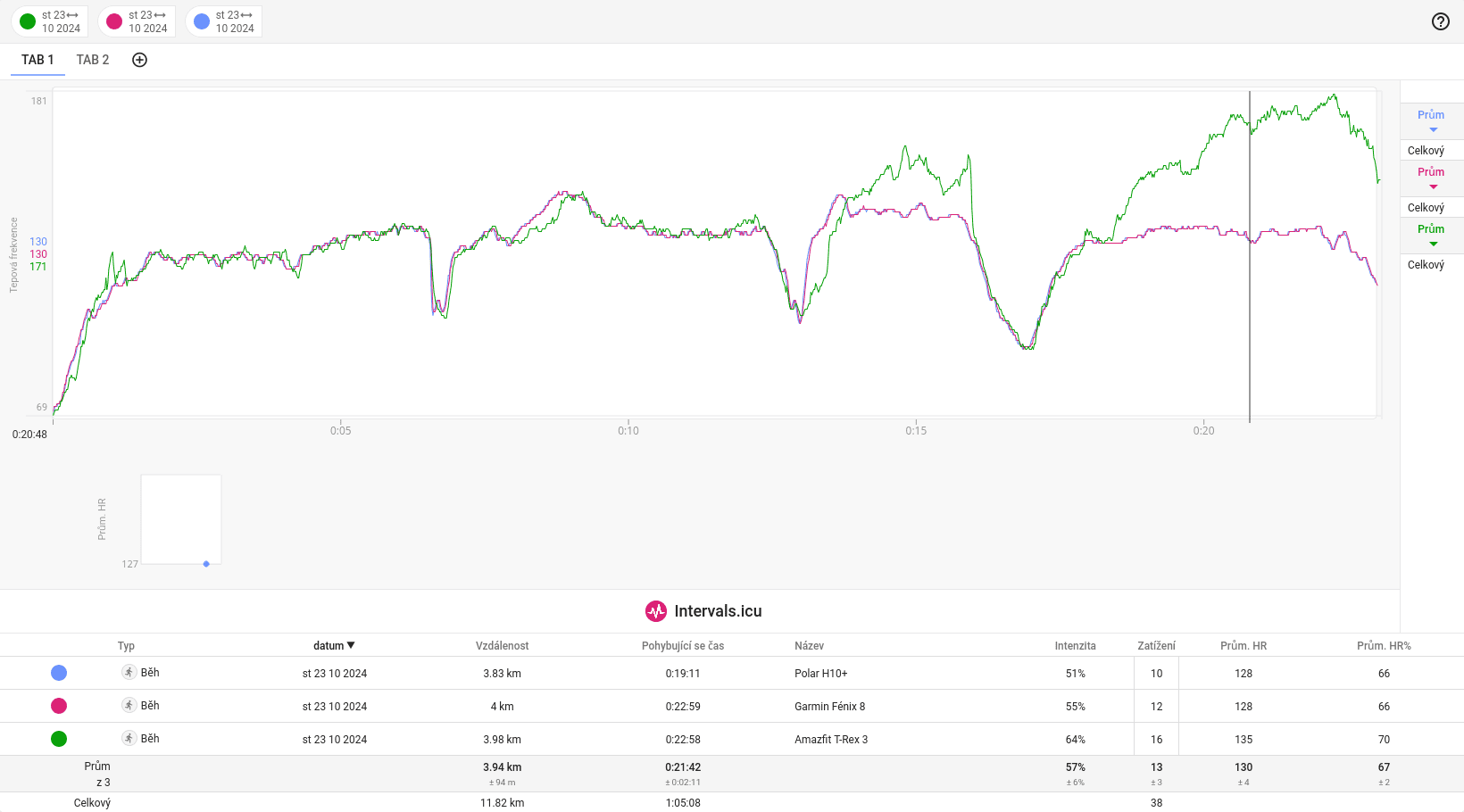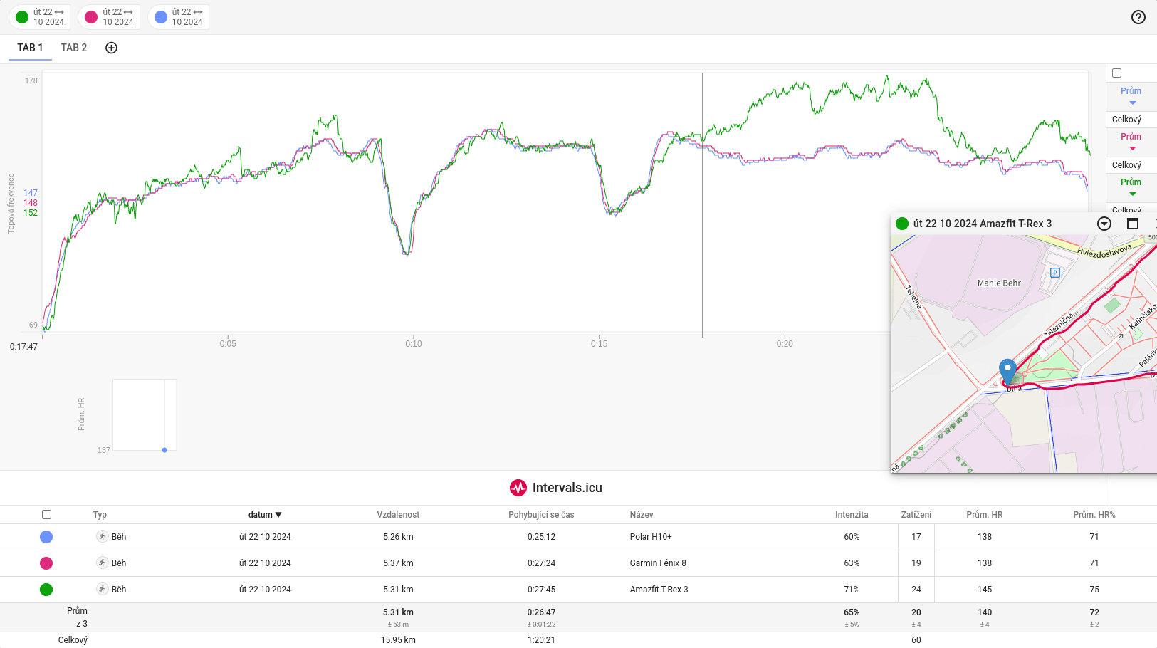 Na poniższym wykresie można zauważyć, że tętno mierzone przez zegarek T-Rex 3 w stabilnych warunkach jest bardziej nieregularne niż w przypadku pozostałych dwóch urządzeń. Jednak zegarek szybko reagował na gwałtowny spadek tętna spowodowany krótkotrwałym zatrzymaniem się lub spowolnieniem. W drugiej połowie biegu moje tętno wzrastało o 10-20 uderzeń więcej niż w przypadku pasa i zegarka Garmin.