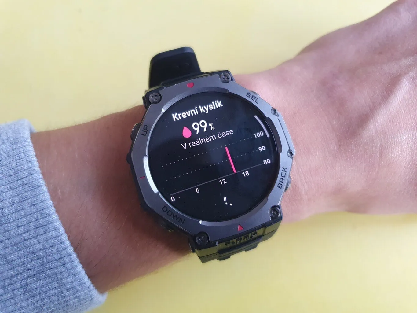 Wyposażony w pulsoksymetr zegarek może monitorować nasycenie krwi tlenem. Pomiar trwa maksymalnie 30 sekund, a w moim przypadku wartości utrzymywały się w zakresie 95-99%, co było zgodne z moim stanem zdrowia.
