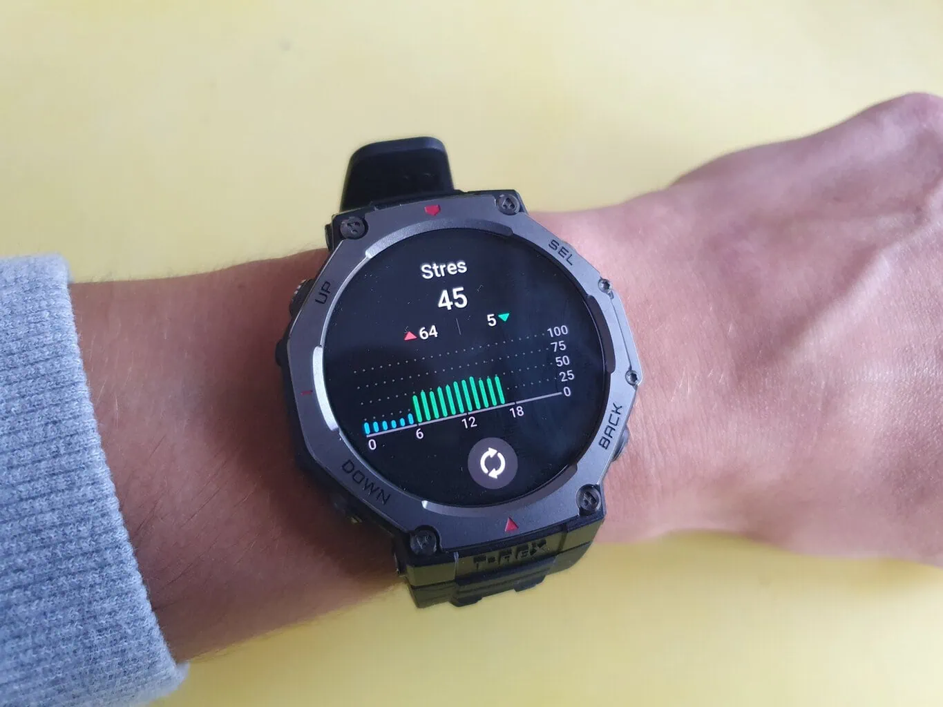 Zegarek mierzy również spoczynkową częstotliwość tętna oraz obciążenie stresem. Najniższa częstotliwość pomiaru tętna to jedna minuta, co nie sprzyja zbytniej dokładności mierzonych wartości. Moim zdaniem przy tak dobrej wydajności baterii można sobie pozwolić na bardziej intensywne pomiary. Ponadto w przypadku pomiaru poziomu stresu można wybrać pomiar automatyczny lub ręczny. Odczyty stresu zmieniały się w ciągu dnia zgodnie z moimi odczuciami, więc oceniam tę funkcję pozytywnie.