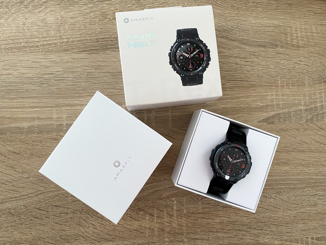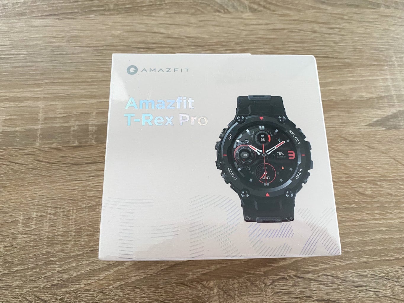 Smartwatch Amazfit T-Rex Pro już na pierwszy rzut oka przyciąga uwagę swoją solidną konstrukcją, z którą spotkamy się również w innych "dinozaurowych" zegarkach marki Amazfit. Sprzedawany jest w klasycznym pudełku o wymiarach 10,5 × 6,5 × 11 cm, a całkowita waga opakowania wynosi 281 gramów.