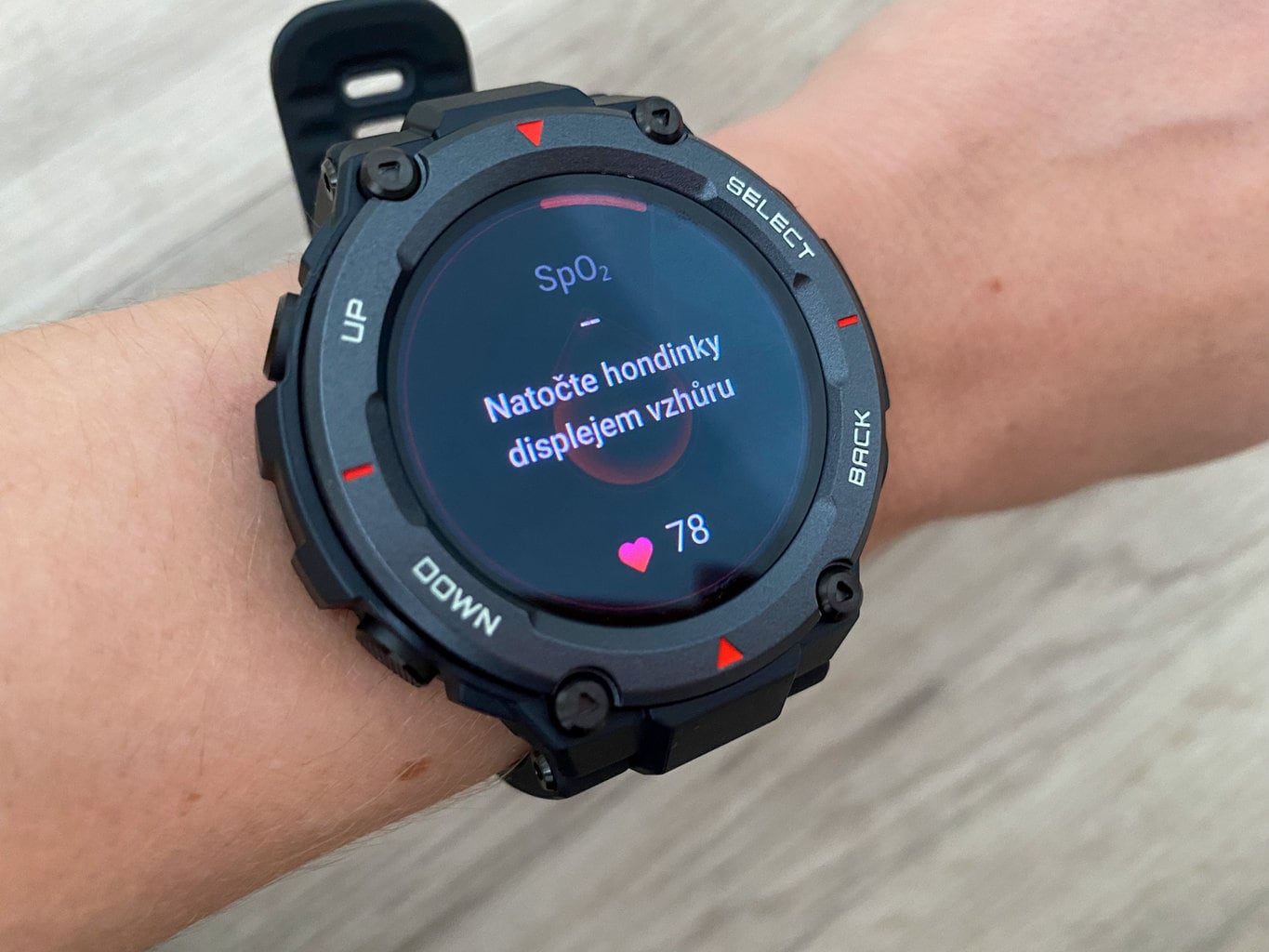 Zegarek wyposażony jest w pulsoksymetr, dzięki czemu umożliwia pomiar natlenienia krwi. Pod tym względem różni się od Amazfit T-Rex, w którym brakowało tej funkcji. Chcąc poznać aktualną wartość natlenienia krwi, należy uruchomić tę funkcję i poczekać chwilę na ostateczny wynik pomiaru.