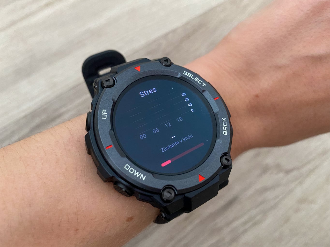 Urządzenie może być również wykorzystywane do monitorowania obciążenia stresem. Sam pomiar trwa około 45 sekund, po upływie których zegarek pokazuje oszacowaną wartość. Bardziej szczegółowe informacje na temat tego parametru będą dostępne w aplikacji mobilnej.