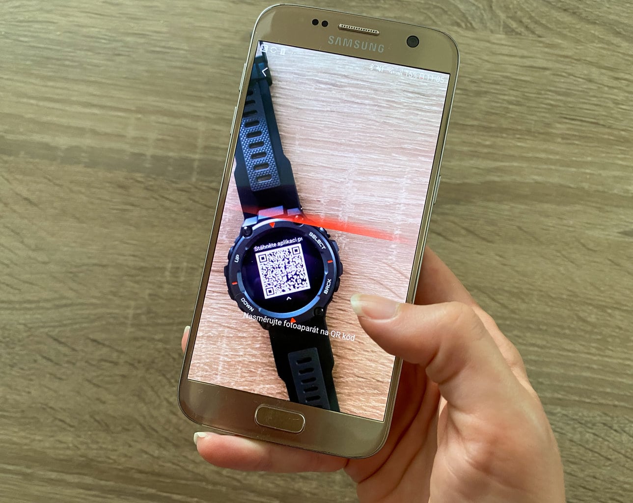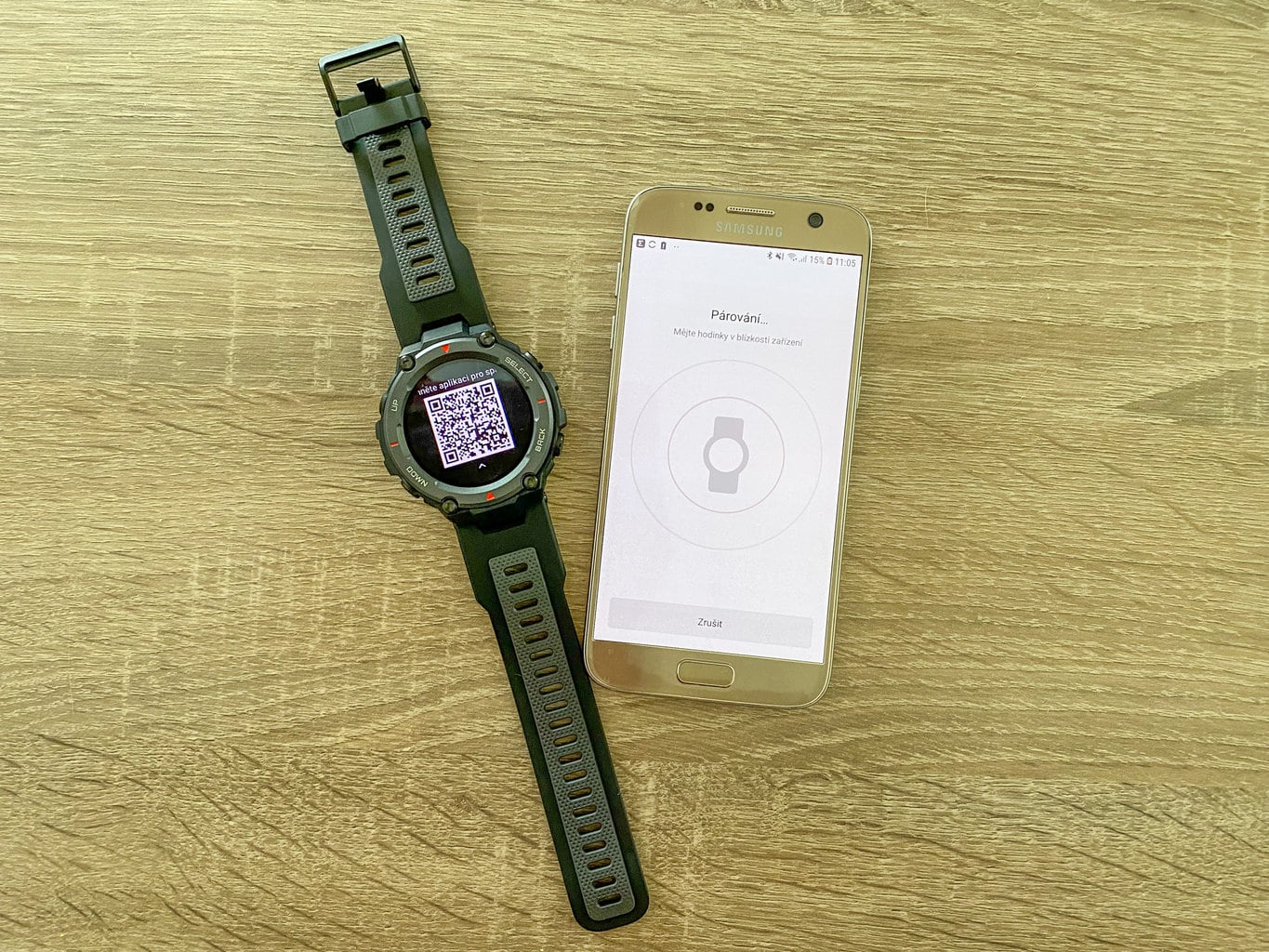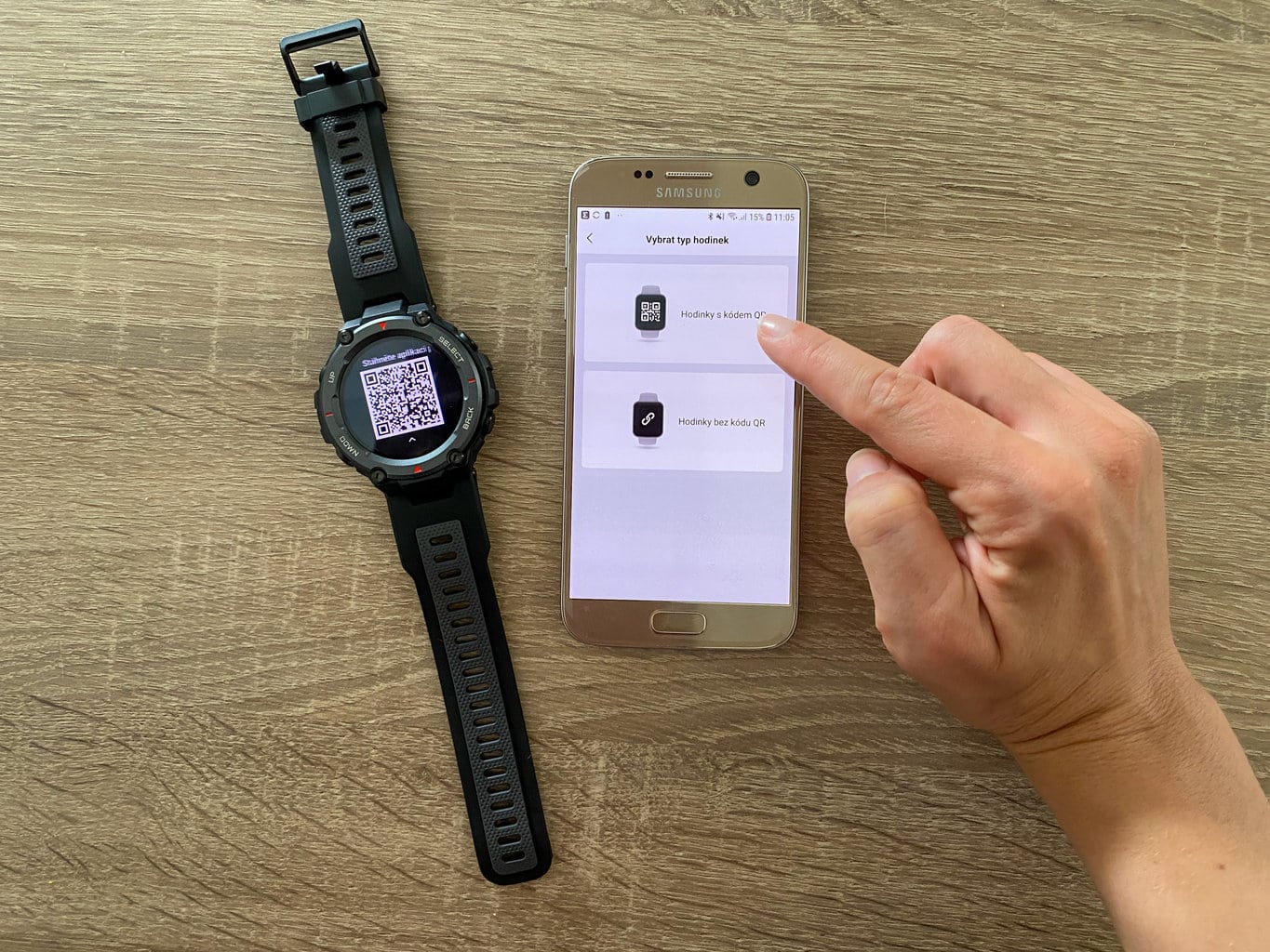 Po uruchomieniu zegarka na wyświetlaczu pojawi się kod QR. Aplikacja mobilna poinformuje Cię, że zakupiono nowy smartwatch z kodem QR. Następnie aplikacja poprosi o zeskanowanie kodu QR i potwierdzenie parowania. Wówczas wszystko będzie już skonfigurowane lub zegarek sam pobierze potrzebne aktualizacje (tak było w przypadku naszego testu).