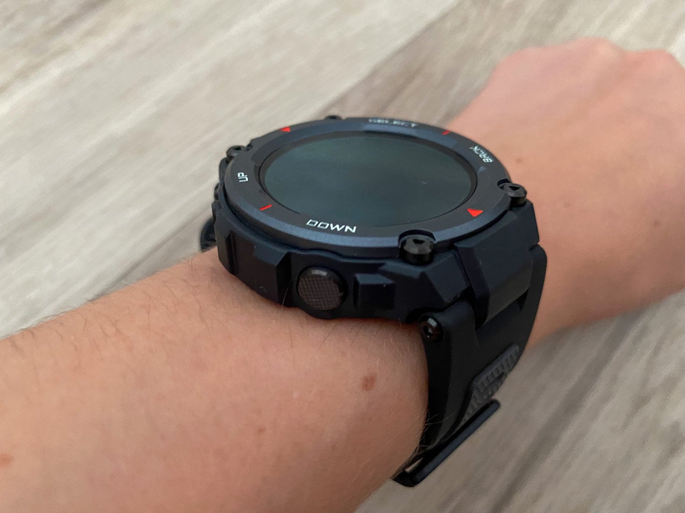 Jeśli chodzi o zastosowany materiał, to dominuje tu utwardzone tworzywo sztuczne i dzięki niemu zegarek waży zaledwie 59,4 grama, co jest świetną wartością jak na zegarek outdoorowy. Dla porównania: waga nowszego modelu Amazfit T-Rex 2 wzrosła aż do 67 gramów.