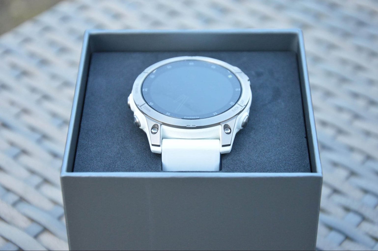 Zegarka Garmin nie kupuje się ze względu na stylowe opakowanie i producent dobrze o tym wie. Opakowanie jest więc typowo minimalistyczne. Zaraz po otwarciu niewielkiego sześciennego kartonika naszym oczom ukazuje się zegarek Garmin EPIX 2 z silikonowym paskiem, który od razu nadaje się do założenia. Pod zegarkiem znajduje się kabel do ładowania, instrukcja obsługi oraz, opcjonalnie, voucher na pobranie mapy TopoActive.