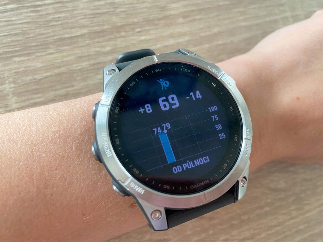 Urządzenie potrafi monitorować poziom równowagi między wysiłkiem a regeneracją organizmu. Zazwyczaj wartość Body Battery jest najwyższa na początku dnia i spada wraz z upływem czasu lub po wysiłku.