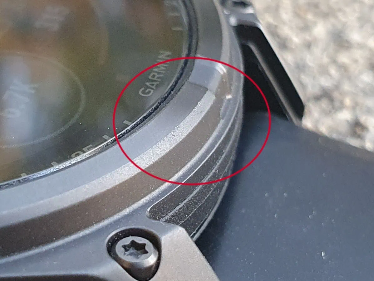 Luneta lekko wystaje ponad poziom wyświetlacza, co chroni go przed uderzeniami z boku. Powierzchnia lunety jest pokryta tzw. DLC (diamond like coating) - powłoką podobną do diamentu. Dzięki niej powinna być bardziej odporna na zarysowania, ale w praktyce to rozwiązanie nie zawsze się sprawdza. Kiedy zmieniałem kasetę w moim rowerze, uderzyłem zegarkiem w aluminiową obręcz, co pozostawiło małe ryski na powierzchni lunety.