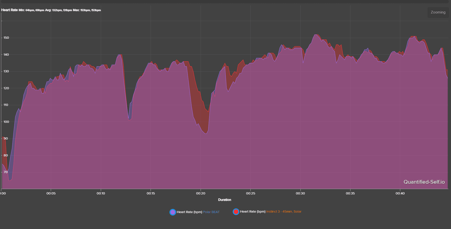 Dokładność pomiaru tętna zależy przede wszystkim od kontaktu sensora z twoją skórą. Najwyższą dokładność osiągniesz, gdy zegarek będzie mocno zapięty. Podczas mojego testowania sensor oferował dość dokładne zapisy. Jak widać na porównaniu z pasem piersiowym Polar H10+ poniżej, oba urządzenia zanotowały porównywalne wartości. Zegarek potrafił reagować na zmiany tętna prawie z taką samą szybkością jak pas.