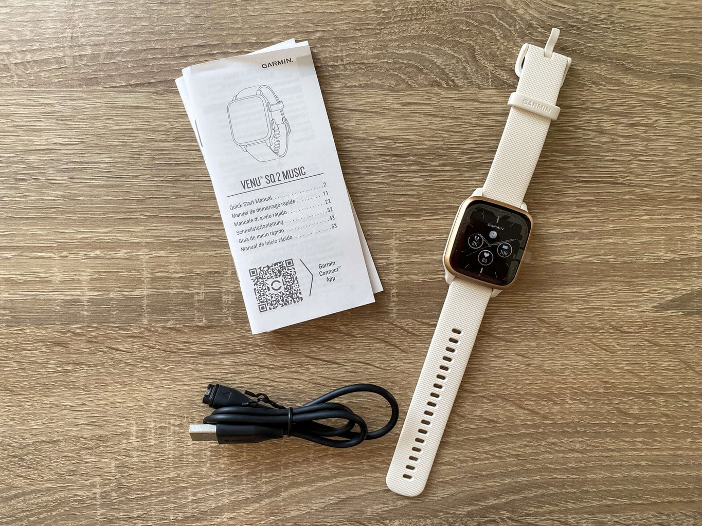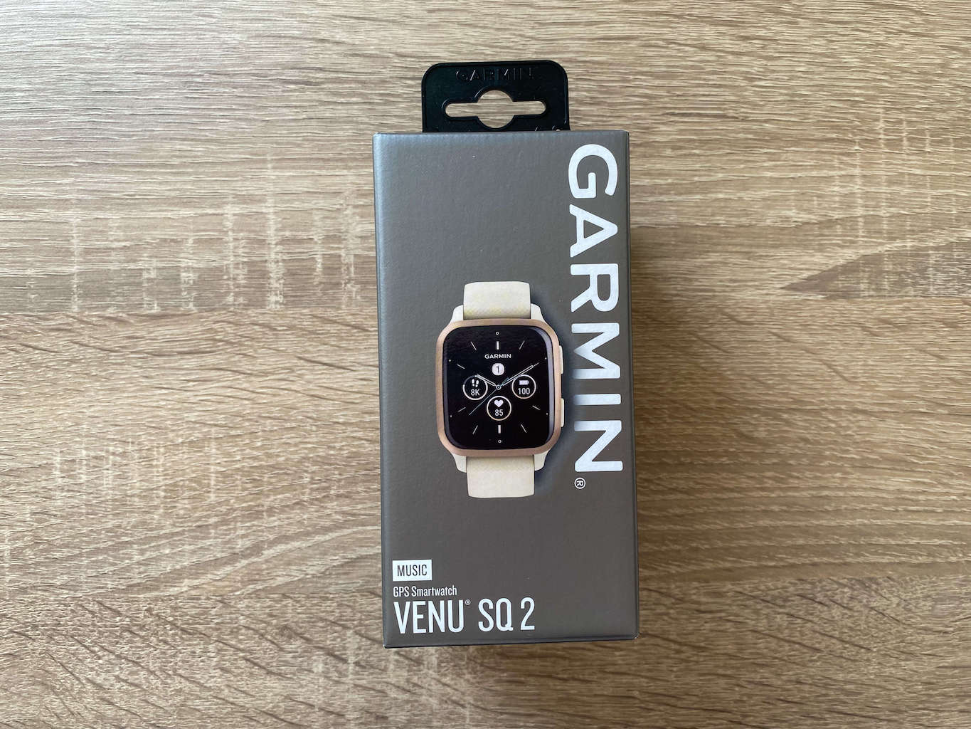 Smartwatch Garmin Venu Sq 2 jest sprzedawany wraz z kompaktowym pudełkiem, które posiada szaro-biały ujednolicony wzór, stosowany obecnie przez Garmin dla wszystkich swoich zegarków. Jego wymiary to 14 × 7 × 7 cm, a waga wynosi 147 gramów. Po otwarciu można się spodziewać: