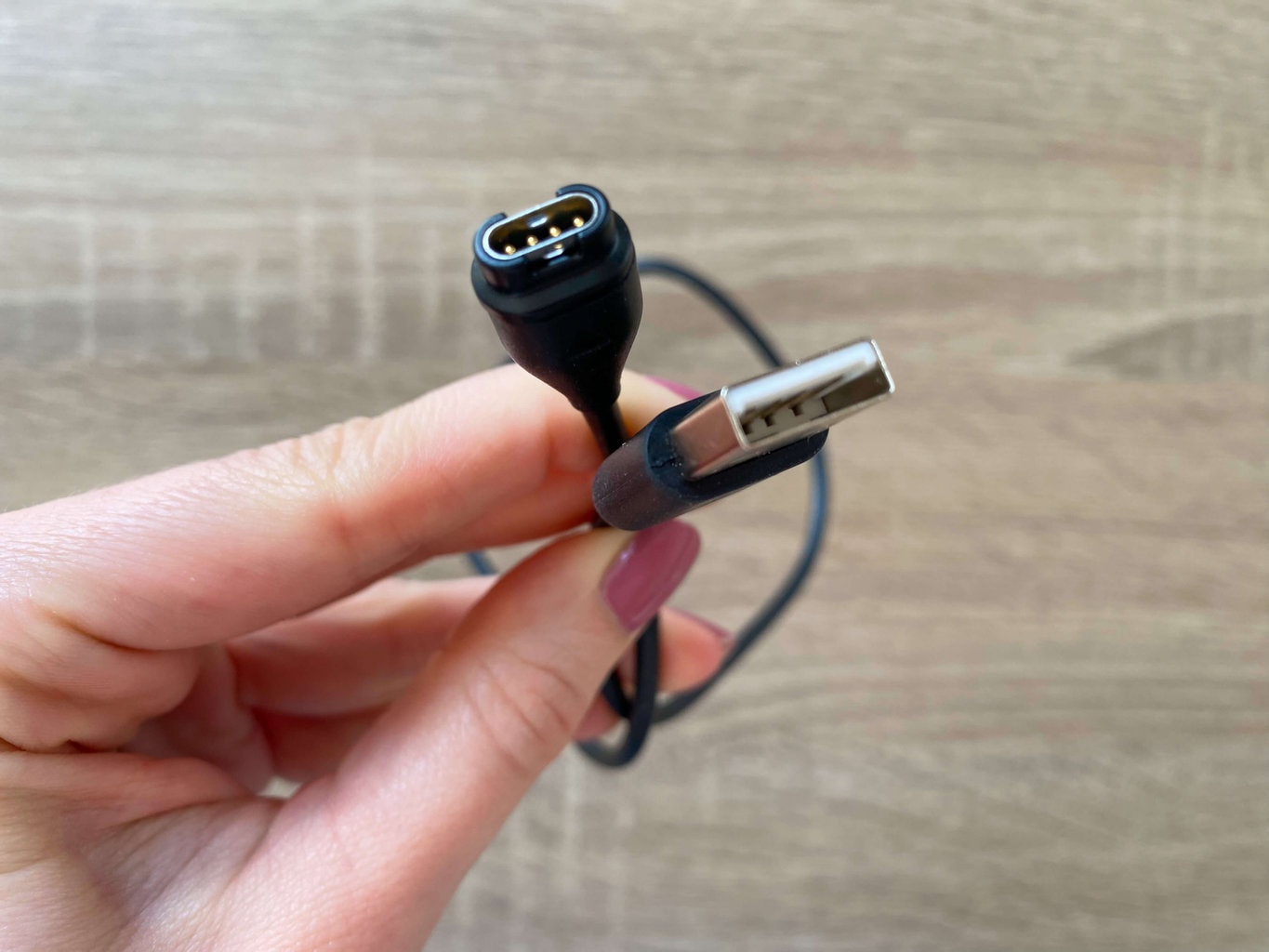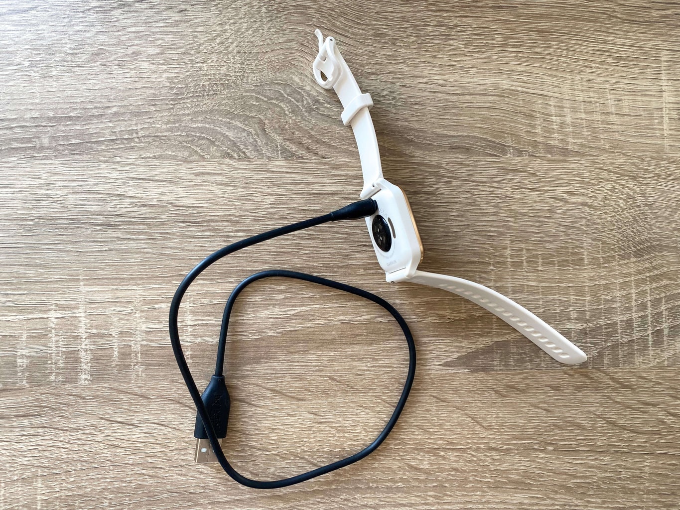 Do ładowania zegarka służy dołączony do zestawu kabel zasilający. W pudełku nie znajdziemy zasilacza, można jednak użyć zwykłej ładowarki do ładowania telefonów komórkowych. W przeciwieństwie do wielu konkurencyjnych marek, Garmin nie używa magnetycznych podstawek. Pełne naładowanie urządzenia trwa około dwóch godzin.
