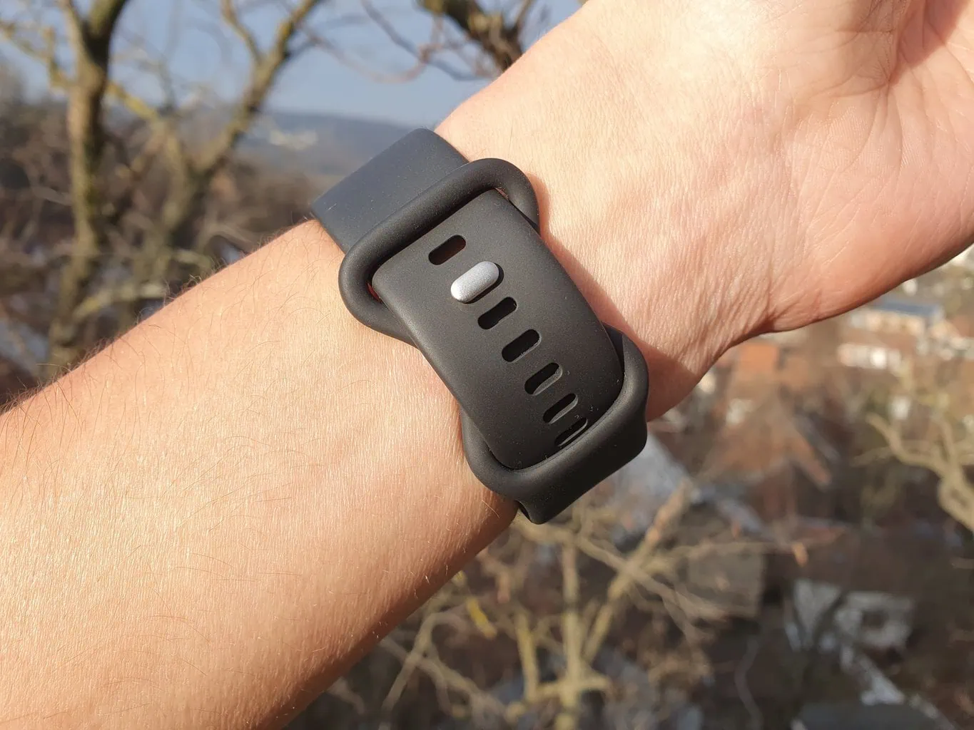 Smartwatch jest dostarczany z silikonowym paskiem w dwóch długościach. Krótszy jest przeznaczony na nadgarstki o obwodzie 130–175 mm, a dłuższy dla obwodu 165–210 mm. Wybrałem krótszą wersję i muszę przyznać, że stanowi doskonały kompromis między komfortem a funkcjonalnością. Elastyczny materiał idealnie dopasowuje się do kształtu nadgarstka i nawet przy mocnym zaciśnięciu smartwatch nie sprawiał mi dyskomfortu.