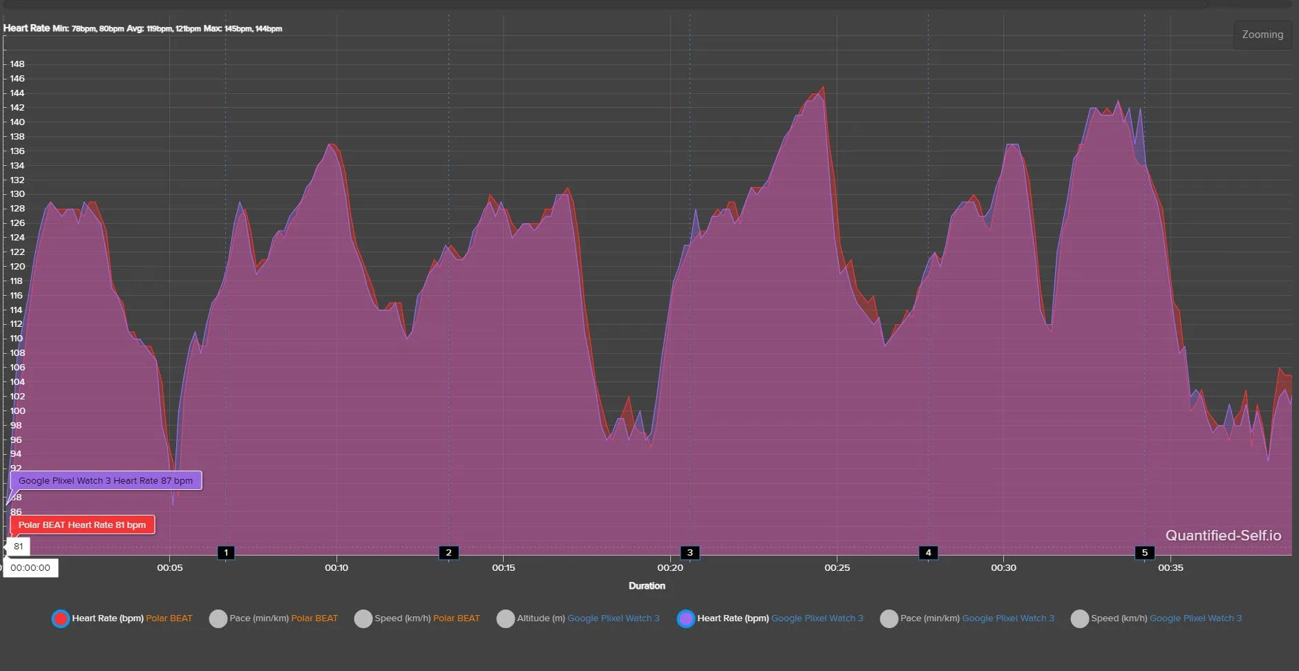 Podstawą analizy biegowej jest pomiar tętna. Jego dokładność porównałem z pasem piersiowym Polar H10+. Jak widać na zrzucie ekranu poniżej, krzywe obu urządzeń są niemal identyczne. To świadczy o znakomitej precyzji, co pozytywnie mnie zaskoczyło. Zegarek doskonale radził sobie także ze zmianami rytmu podczas biegów interwałowych.