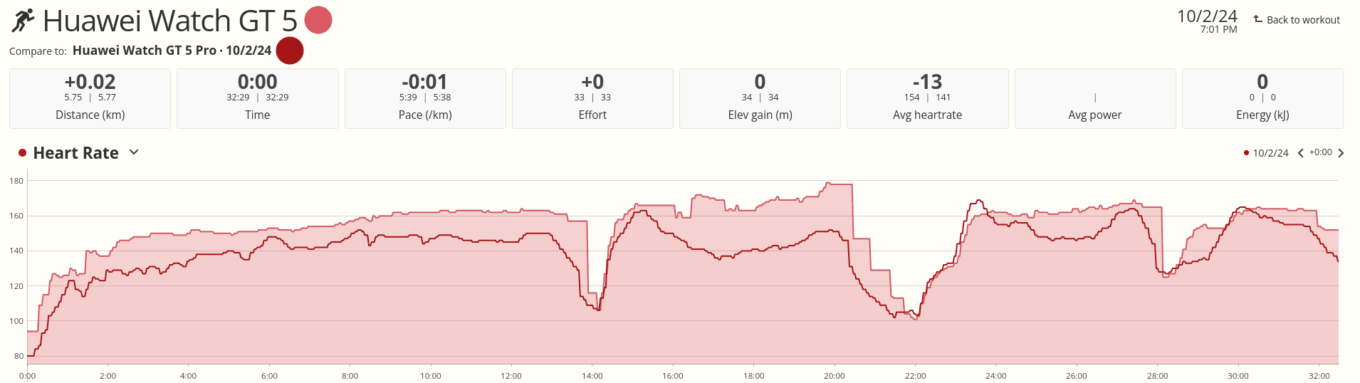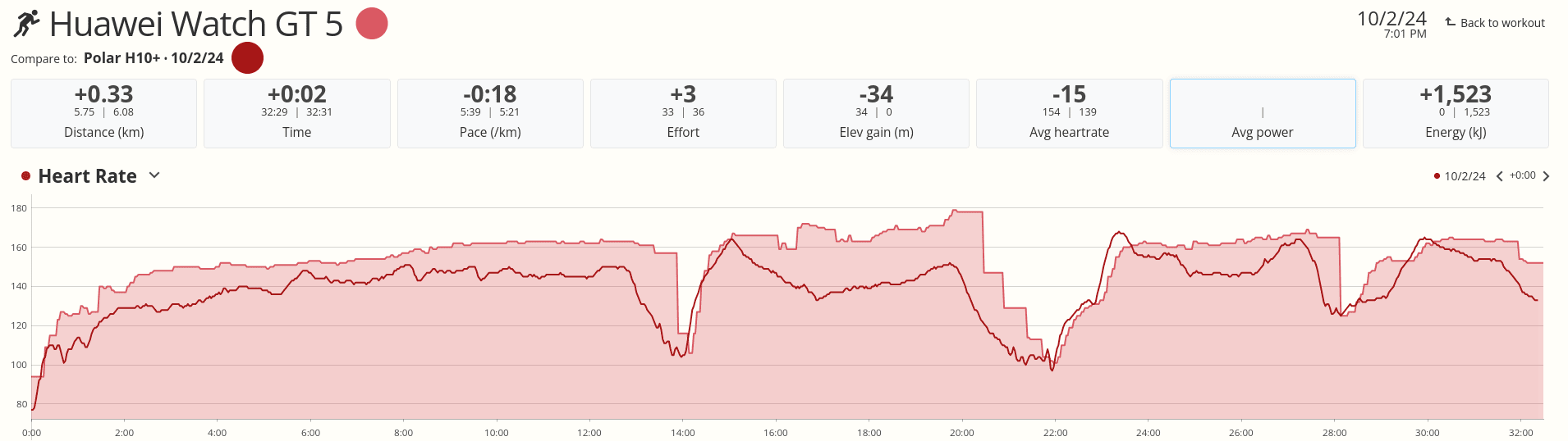 Jak widać na poniższym obrazku, Watch GT 5 rejestrował wyższe tętno niemal przez cały czas w porównaniu z pasem na klatkę piersiową Polar H10. Następny slajd ponownie porównuje tętno z Watch GT 5 Pro z tym samym czujnikiem, ale innym paskiem. Tak więc dokładność jest ponownie na niekorzyść Watch 5.