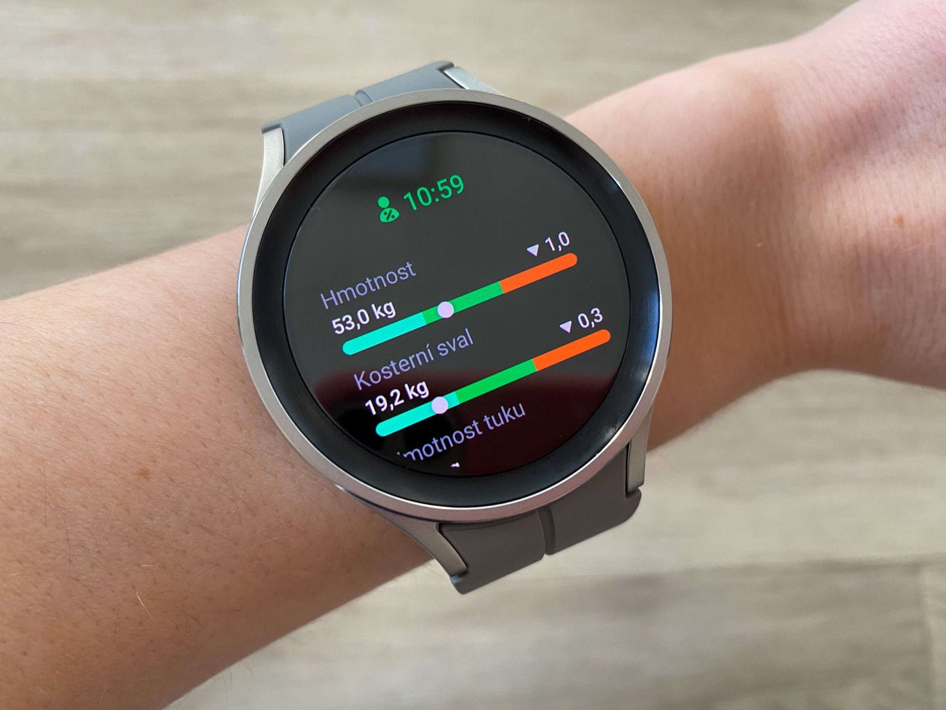 Ciekawą funkcją zegarka Samsung jest analiza składu ciała. Najpierw należy wprowadzić swoją płeć, wzrost i wagę. Następnie wykonujesz pomiary, a zegarek poinformuje Cię o procentowej zawartości mięśni szkieletowych, tłuszczu i wody w Twoim organizmie. Dostępne są również dane BMI.