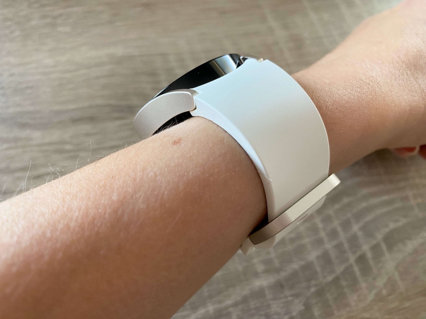 Należy zauważyć, że pasek powinien mieć o kilka dodatkowych otworów więcej (lub mógłby być krótszy). Nasz recenzentka z wąskim nadgarstkiem (15 cm w obwodzie) musiała zapiąć sprzączkę paska aż na ostatniej dziurce. Ponieważ testowaliśmy model dla pań, spodziewalibyśmy się pewnej regulacji również pod tym względem. Z drugiej strony pasek można łatwo wymienić. Jeśli Twój nadgarstek ma mniej niż 15 cm w obwodzie, od razu zalecamy zakup innego paska.