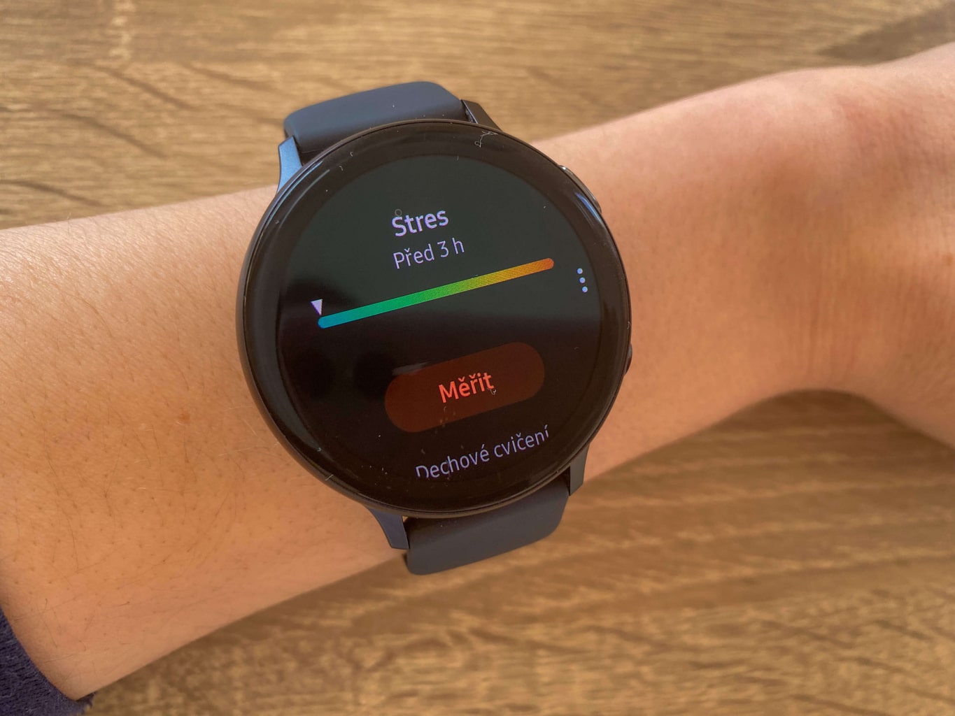 Możesz także mierzyć aktualny poziom stresu, który działa na podstawie pomiarów wahań tętna. Wynik pomiaru jest wyświetlany na kolorowej skali.