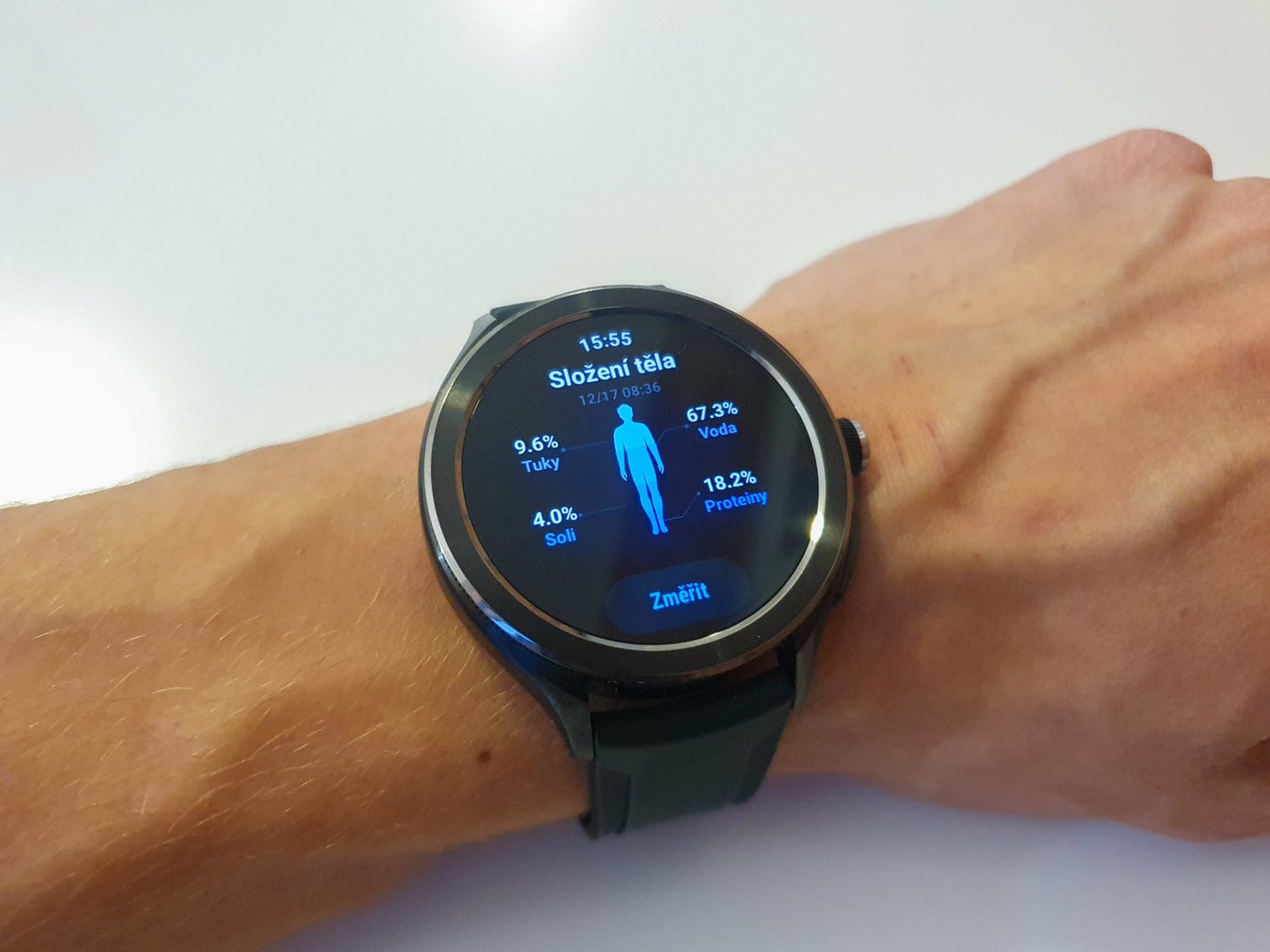 Zegarek określa skład ciała podczas pomiaru: wymaga on umieszczenia dwóch palców na bocznych przyciskach zegarka, które działają w tym przypadku jako przewodniki. Pomiar trwa około minuty i jest bardzo wrażliwy na wszelkie ruchy palców lub dłoni. Zwykle byliśmy w stanie uzyskać udany pomiar po pięciu próbach.