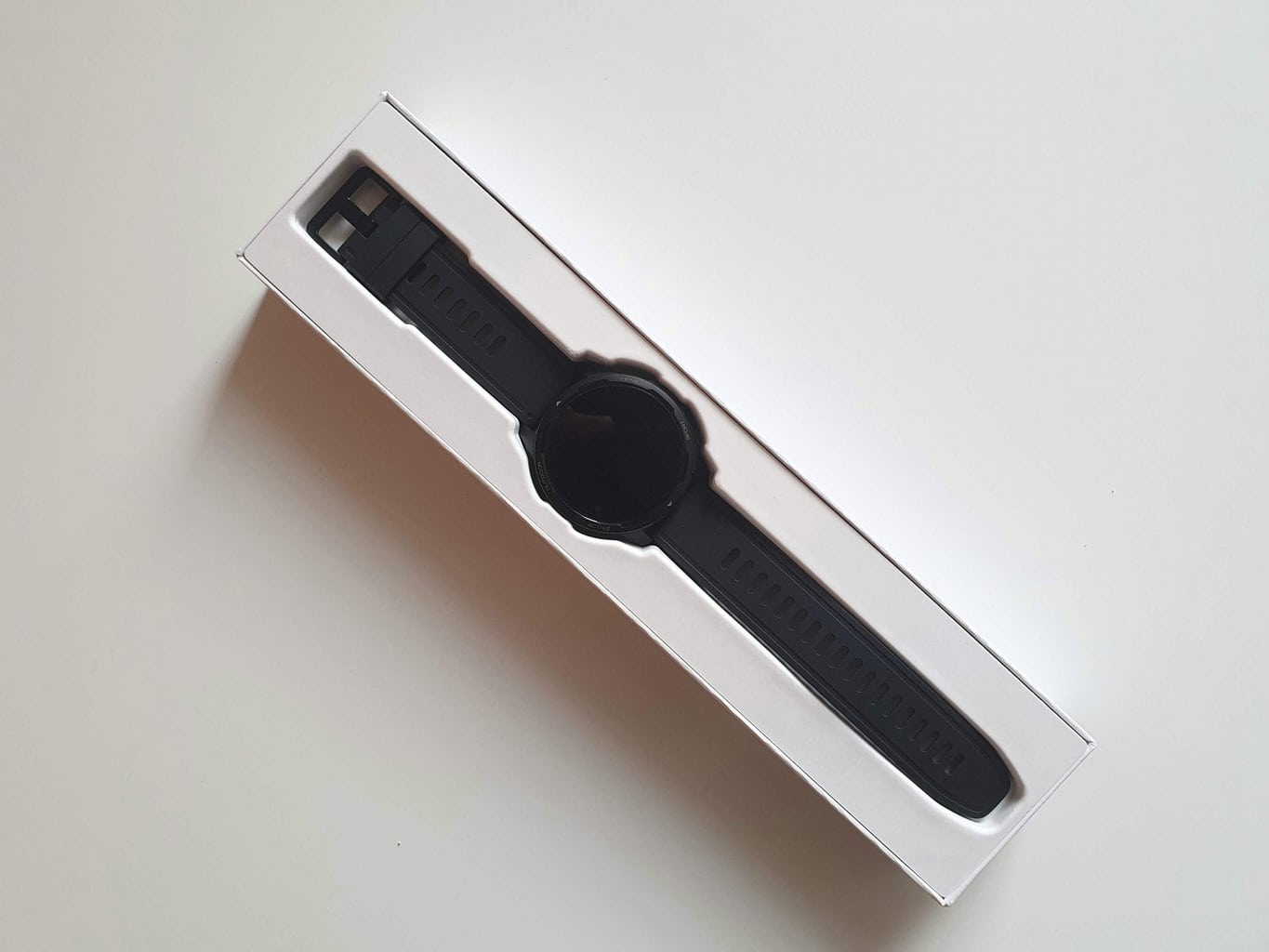 Opakowanie zegarka jest kompaktowe i zawiera akcesoria niezbędne do korzystania z urządzenia. Z drugiej strony, białe smukłe pudełko wygląda stosunkowo elegancko. Po jego otwarciu natknęliśmy się na następujące elementy: