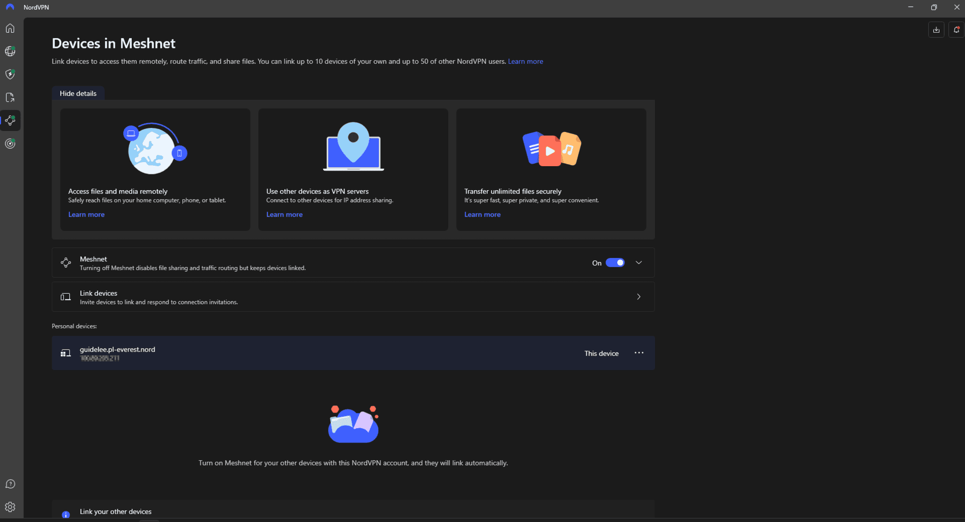Funkcja pozwala bezpiecznie połączyć twoje urządzenia ze sobą lub z innymi użytkownikami, niezależnie od ich lokalizacji. Dane są szyfrowane, a komunikacja odbywa się bez konieczności przechodzenia przez serwer VPN, co zapewnia szybkość i prywatność. Meshnet idealnie sprawdza się np. do zdalnego dostępu do domowego komputera, grania w gry LAN na odległość lub bezpiecznego udostępniania plików. Działa na wszystkich platformach i jest dostępna we wszystkich taryfach.