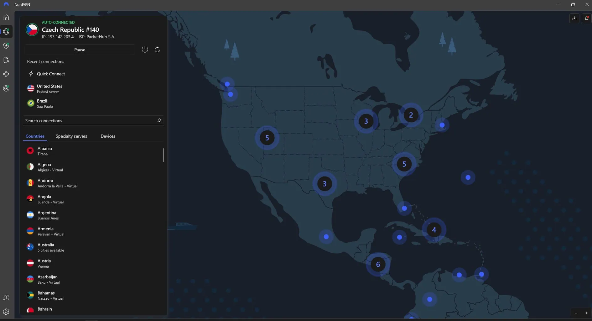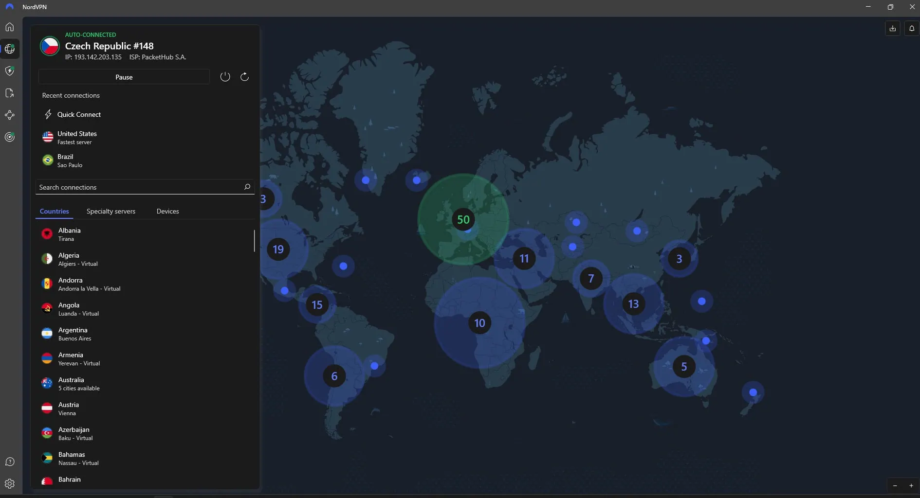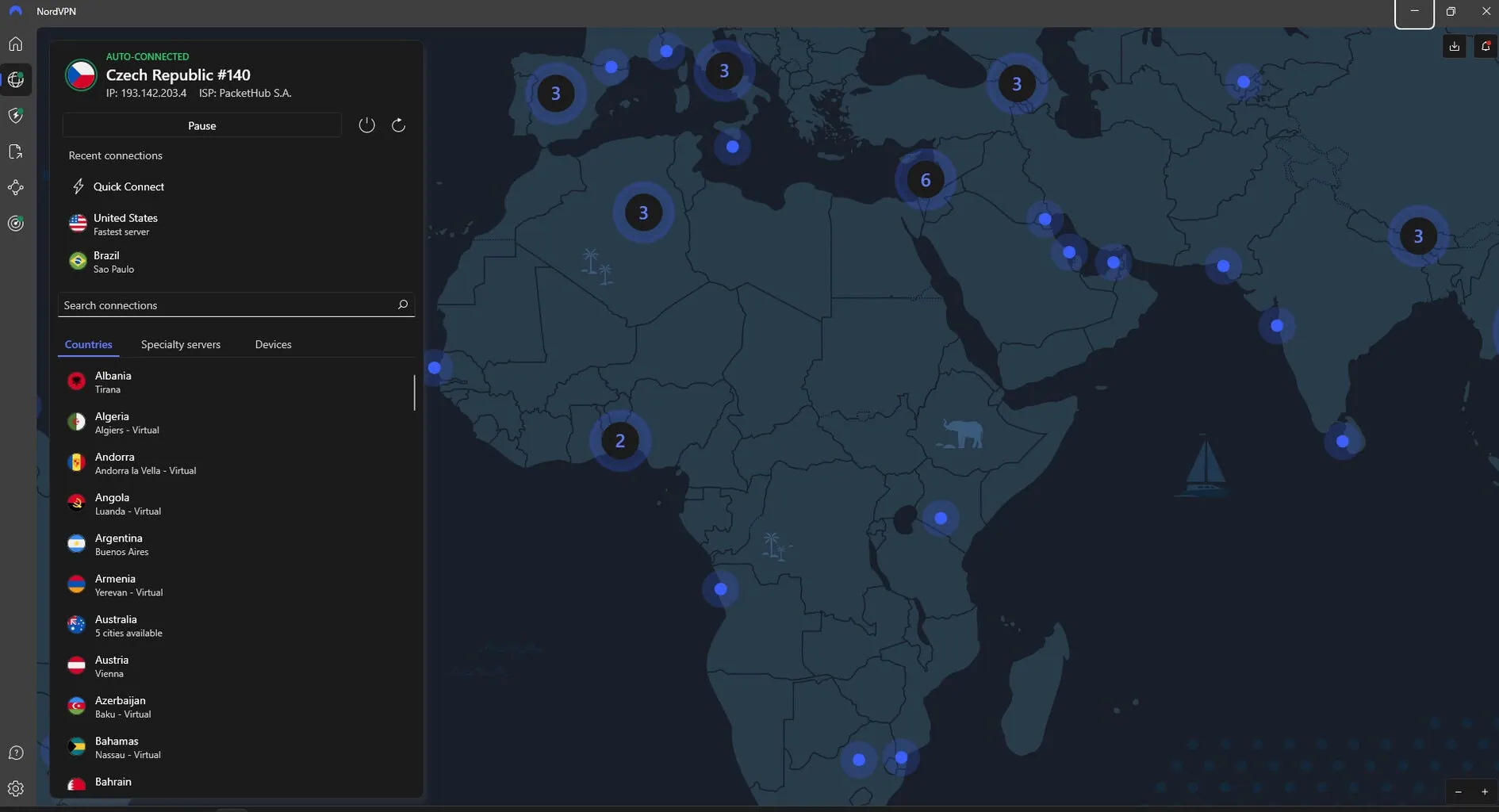 NordVPN oferuje ponad 7 400 serwerów w 118 krajach na całym świecie, w tym także w państwach afrykańskich czy na Bliskim Wschodzie. Razem z Proton VPN (117), ExpressVPN (105) oraz Surfsharkiem (100+) NordVPN należy do ścisłej czołówki rynku. W wersji desktopowej klienta na Windows możesz wybrać kraj z listy lub za pomocą przejrzystej mapy. Możesz też skorzystać z opcji Quick Connect, która automatycznie wybierze najlepszy kraj i serwer na podstawie twojej aktualnej lokalizacji.