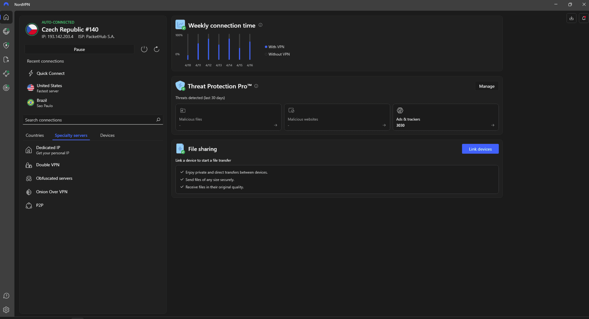 Podczas odwiedzania niebezpiecznych stron, gdzie niemal każde kliknięcie oznaczało otwarcie uciążliwej reklamy lub automatyczne pobieranie podejrzanych plików, NordVPN skutecznie radził sobie z większością zagrożeń. Wyskakujące reklamy się nie pojawiały, a pobieranie plików nawet się nie rozpoczynało.