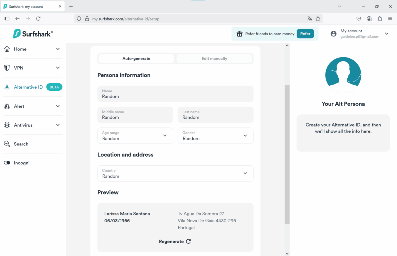 Celem jest przede wszystkim ograniczenie ilości danych osobowych, które udostępniasz w internecie, co znacząco zmniejsza ryzyko ich nadużycia. W praktyce funkcja Alternative ID działa bardzo dobrze. Zainteresowała mnie wyjątkowo korzystna oferta w nieznanym sklepie internetowym, przeznaczona wyłącznie dla nowych użytkowników po rejestracji. Zamiast podawać swój prywatny adres e-mail i imię, utworzyłem przez SurfShark losową alternatywną tożsamość. Po rejestracji e-mail z kuponem został przekierowany do mojej prywatnej skrzynki, bez ujawniania jej sklepowi i bez ryzyka zalania spamem z kolejnymi ofertami, ponieważ po wykorzystaniu po prostu ją dezaktywowałem.