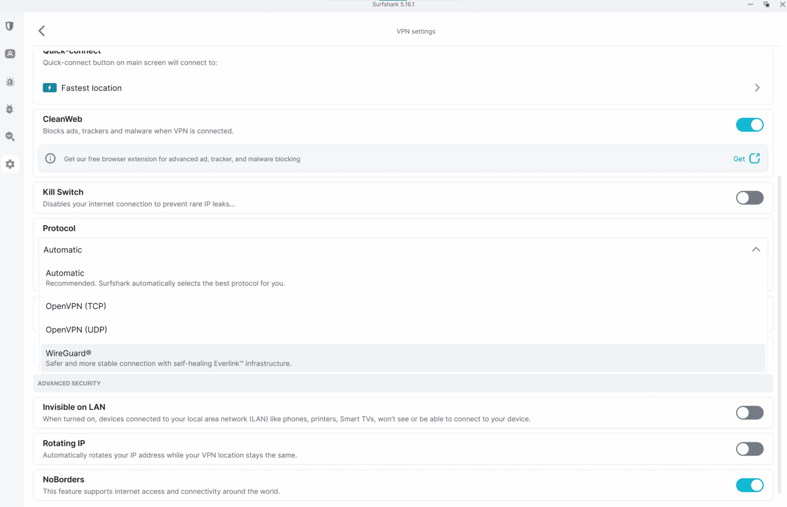 SurfShark to jedna z usług VPN, które kładą nacisk na elastyczność i bezpieczeństwo. W ustawieniach możesz wybrać protokół VPN w zależności od preferowanego typu połączenia lub używanego urządzenia. Każdy z nich ma swoje zalety i wady. Nie musisz jednak wybierać go ręcznie. Domyślnie VPN jest skonfigurowany tak, aby automatycznie dobierać optymalny protokół w zależności od warunków sieciowych.