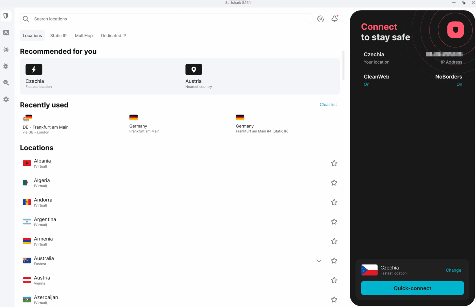 Dostępne kraje są uporządkowane na liście, jednak mapa świata, którą znajdziesz u ProtonVPN czy NordVPN, niestety tutaj nie występuje. Niektóre lokalizacje oznaczone są jako Virtual. Oznacza to, że serwery w danym kraju nie istnieją fizycznie, lecz są wirtualnie emulowane i mogą współdzielić sprzęt z innymi usługami. Z punktu widzenia bezpieczeństwa nie jest to rozwiązanie idealne. Dotyczy to jednak głównie odległych krajów, które nie są często wybierane przez użytkowników.